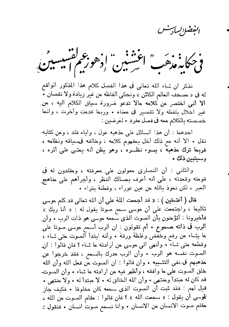 قَالَ أغشتين قد أَجمعت الْملَّة على أَن الله تَعَالَى قد كلم مُوسَى تكليما وَاجْتمعت على أَن مُوسَى سمع صَوتا يَقُول لَهُ أَنا رَبك فأخبرونا أتؤمنون بِأَن الصَّوْت الَّذِي سَمعه مُوسَى هُوَ ذَات الرب وَأَن الرب فِي ذَاته مسموع أم تَقولُونَ إِن الرب أسمع مُوسَى صَوتا على مَا يَشَاء من رفع وخفض وغلظة ورقة وَأَنه ابْتَدَأَ الصَّوْت مَتى شَاءَ وقطعه مَتى شَاءَ وأنهى إِلَى مُوسَى من إِرَادَته مَا شَاءَ فَإِن قَالُوا إِن الصَّوْت نَفسه هُوَ الرب وَأَن الرب مدرك بِالسَّمْعِ فقد خَرجُوا عَن مَذْهَبهم فِي نفى التَّشْبِيه وَإِن قَالُوا إِن الصَّوْت من فعل الله وَأَن الله خلق الصَّوْت على مَا وَافقه وَأظْهر فِيهِ من إِرَادَته مَا شَاءَ وَأَن الصَّوْت قد كَانَ لَهُ مُبْتَدأ ومنتهى وَأَن الله الْخَالِق لَهُ لَا مُبْتَدأ لَهُ وَلَا مُنْتَهى قيل لَهُم فقد ثَبت أَن الصَّوْت الَّذِي سَمعه كَانَ مخلوقا فَكيف جَازَ لمُوسَى أَن يَقُول سَمِعت الله فَإِن قَالُوا مقَام الصَّوْت من الله مقَام صَوت الْإِنْسَان من الْإِنْسَان وَأَنا نسْمع صَوت إِنْسَان فَنَقُول