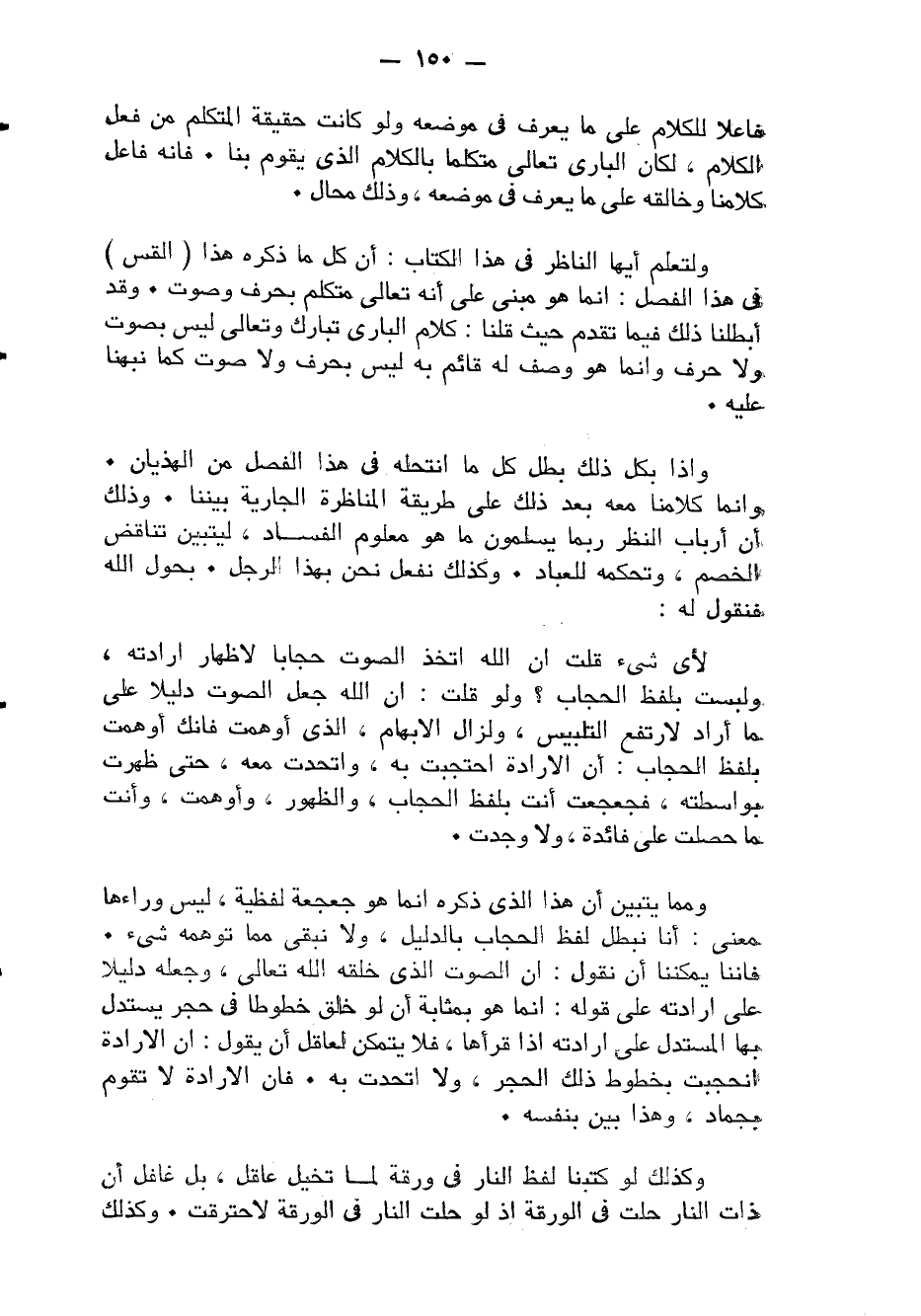 وَمِمَّا يتَبَيَّن أَن هَذَا الَّذِي ذكره إِنَّمَا هُوَ جعجعة لفظية لَيْسَ وَرَاءَهَا معنى أَنا نبطل لفظ الْحجاب بِالدَّلِيلِ وَلَا نبقى مِمَّا توهمه شَيْء فإننا يمكننا أَن نقُول إِن الصَّوْت الَّذِي خلقه الله تَعَالَى وَجعله دَلِيلا على إِرَادَته على قَوْله إِنَّمَا هُوَ بِمَثَابَة أَن لَو خلق خُطُوطًا فِي حجر يسْتَدلّ بهَا الْمُسْتَدلّ على إِرَادَته إِذا قَرَأَهَا فَلَا يتَمَكَّن لعاقل أَن يَقُول إِن الْإِرَادَة انحجبت بخطوط ذَلِك الْحجر وَلَا اتّحدت بِهِ فَإِن الْإِرَادَة لَا تقوم بجماد وَهَذَا بَين بِنَفسِهِ