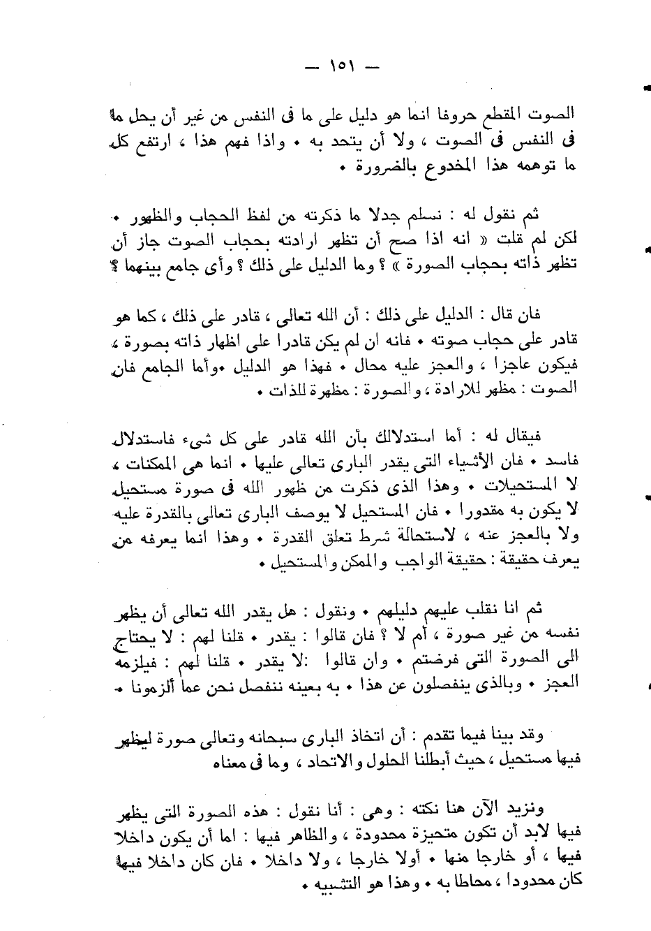 ثمَّ نقُول لَهُ نسلم جدلا مَا ذكرته من لفظ الْحجاب والظهور لَكِن لم قلت أَنه إِذا صَحَّ أَن تظهر إِرَادَته بحجاب الصَّوْت جَازَ أَن تظهر ذَاته بحجاب الصُّورَة وَمَا الدَّلِيل على ذَلِك وَأي جَامع بَينهمَا