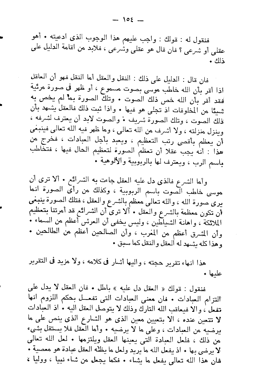 فَنَقُول قَوْلك الْعقل دلّ عَلَيْهِ بَاطِل فَإِن الْعقل لَا يدل على الْتِزَام الْعِبَادَات فَإِن معنى الْعِبَادَات الَّتِي تفعل بِحكم اللُّزُوم إِنَّهَا تفعل وَإِلَّا فيعاقب الله التارك وَذَلِكَ لَا يتَوَصَّل الْعقل إِلَيْهِ إِذْ الْعِبَادَات لَا تتَعَيَّن عِنْده إِلَّا بِتَعْيِين معِين الَّذِي هُوَ الشَّارِع الَّذِي ينص على مَا يرضيه من الْعِبَادَات وعَلى مَا لَا يرضيه وَأما الْعقل فَلَا يسْتَقلّ بِشَيْء من ذَلِك فَلَعَلَّ الْعِبَادَة الَّتِي يعينها الْعقل ويلتزمها لَعَلَّ الله تَعَالَى لَا يرضى بهَا إِذْ يفعل الله مَا يُرِيد وَلَعَلَّ مَا يَظُنّهُ الْعقل عبَادَة هُوَ مَعْصِيّة فَإِن هَذَا الله تَعَالَى يفعل مَا يَشَاء فَكَمَا يَجْعَل من شَاءَ نَبيا ووليا