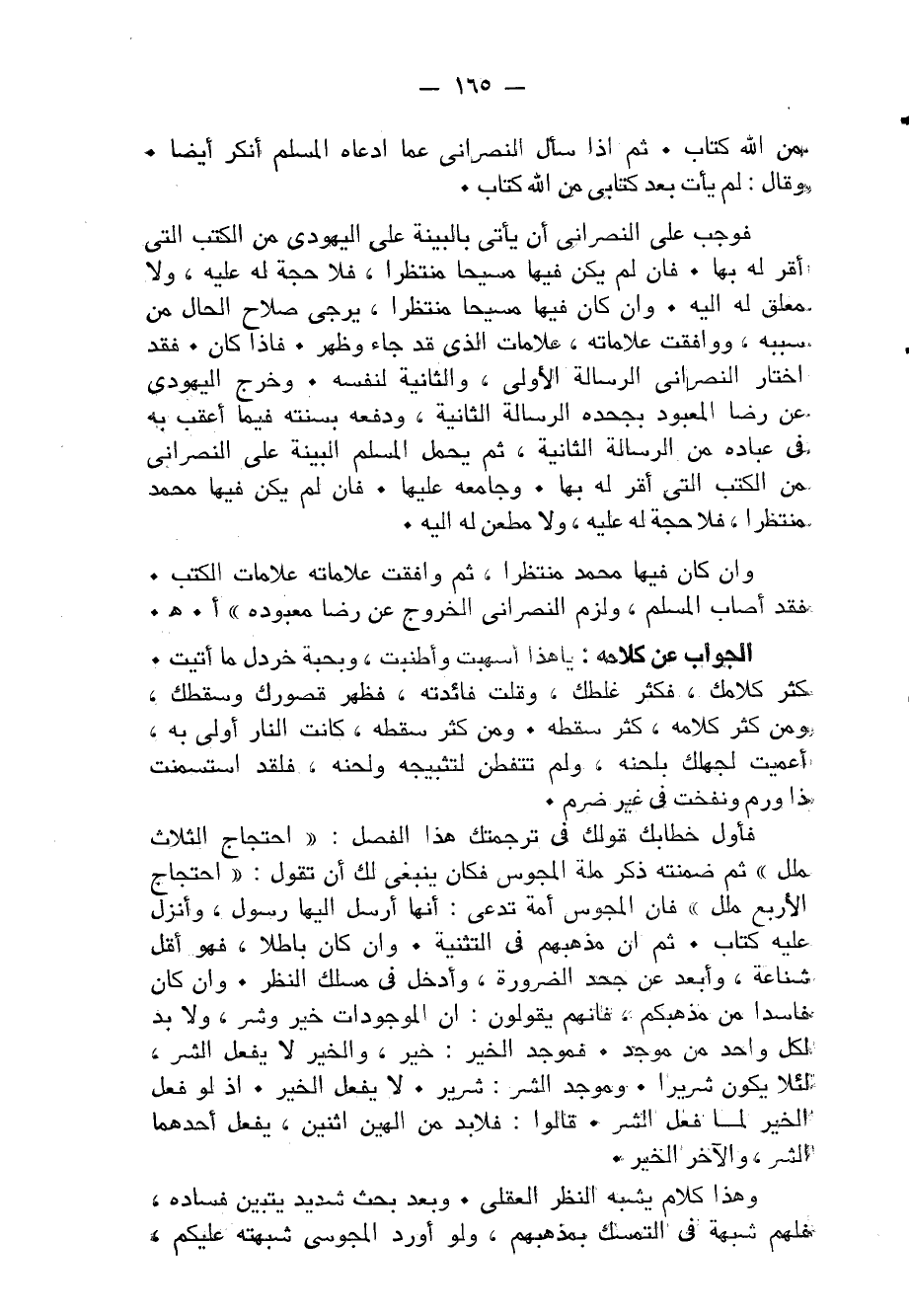 فَأول خطابك قَوْلك فِي ترجمتك هَذَا الْفَصْل احتجاج الثَّلَاث ملل ثمَّ ضمنته ذكر مِلَّة الْمَجُوس فَكَانَ يَنْبَغِي لَك أَن تَقول احتجاج الْأَرْبَع ملل فَإِن الْمَجُوس أمة تدعى أَنَّهَا أرسل إِلَيْهَا رَسُول وَأنزل عَلَيْهِ كتاب ثمَّ إِن مَذْهَبهم فِي التَّثْنِيَة وَإِن كَانَ بَاطِلا فَهُوَ أقل شناعة وَأبْعد عَن جحد الضَّرُورَة وَأدْخل فِي مَسْلَك النّظر وَإِن كَانَ فَاسِدا من مذهبكم فَإِنَّهُم يَقُولُونَ إِن الموجودات خير وَشر وَلَا بُد لكل وَاحِد من موجد فموجد الْخَيْر خير وَالْخَيْر لَا يفعل الشَّرّ لِئَلَّا يكون شريرا وموجد الشَّرّ شرير لَا يفعل الْخَيْر إِذْ لَو فعل الْخَيْر لما فعل الشَّرّ قَالُوا فَلَا بُد من إِلَهَيْنِ إثنين يفعل أَحدهمَا الشَّرّ وَالْآخر الْخَيْر