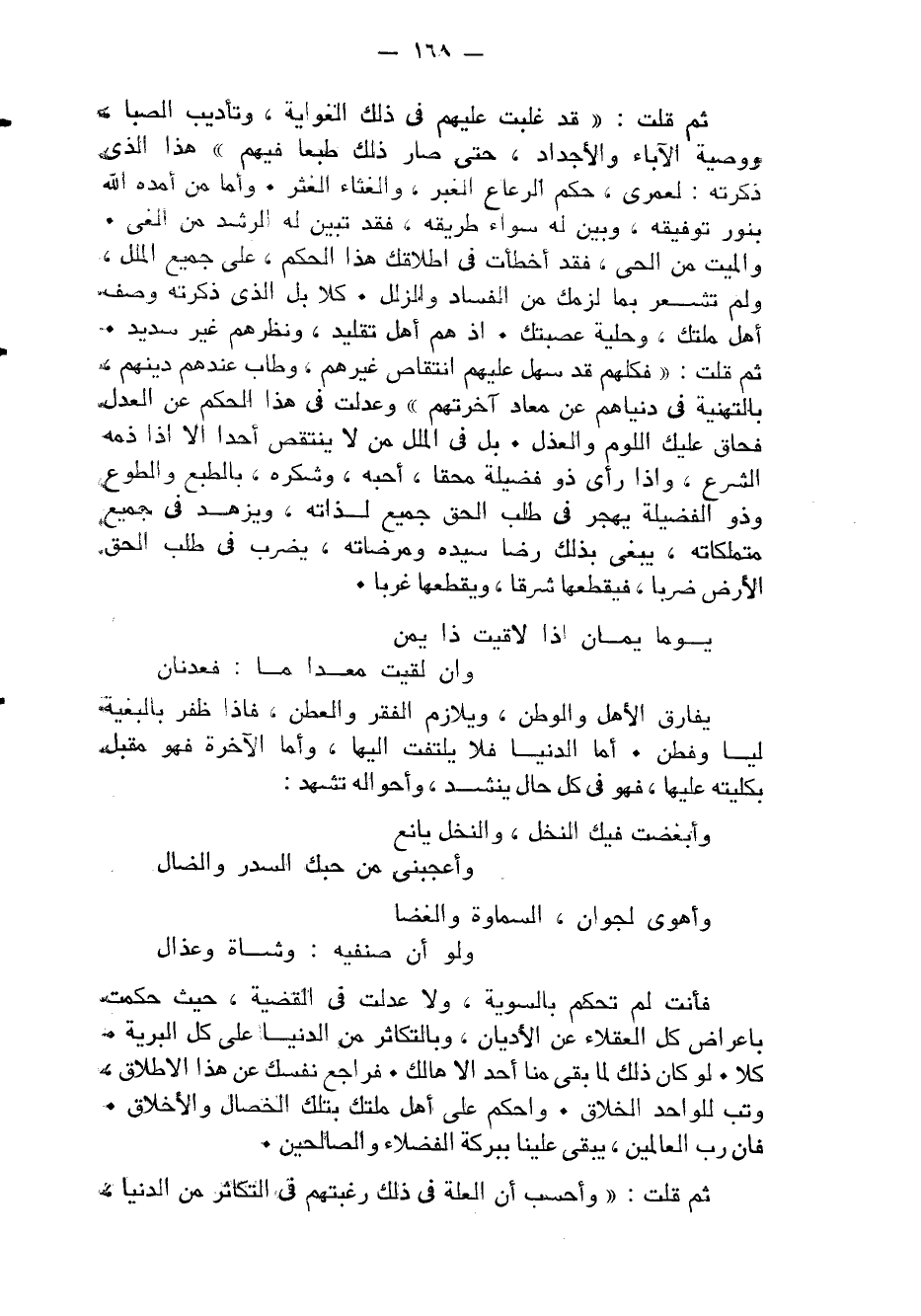 فَأَنت لم تحكم بِالسَّوِيَّةِ وَلَا عدلت فِي الْقَضِيَّة حَيْثُ حكمت بإعراض كل الْعُقَلَاء عَن الْأَدْيَان وبالتكاثر من الدُّنْيَا على كل الْبَريَّة كلا لَو كَانَ ذَلِك لما بقى منا أحد إِلَّا هَالك فراجع نَفسك عَن هَذَا الْإِطْلَاق وَتب للْوَاحِد الخلاق واحكم على أهل ملتك بِتِلْكَ الْخِصَال والأخلاق فَإِن رب الْعَالمين يبْقى علينا ببركة الْفُضَلَاء وَالصَّالِحِينَ