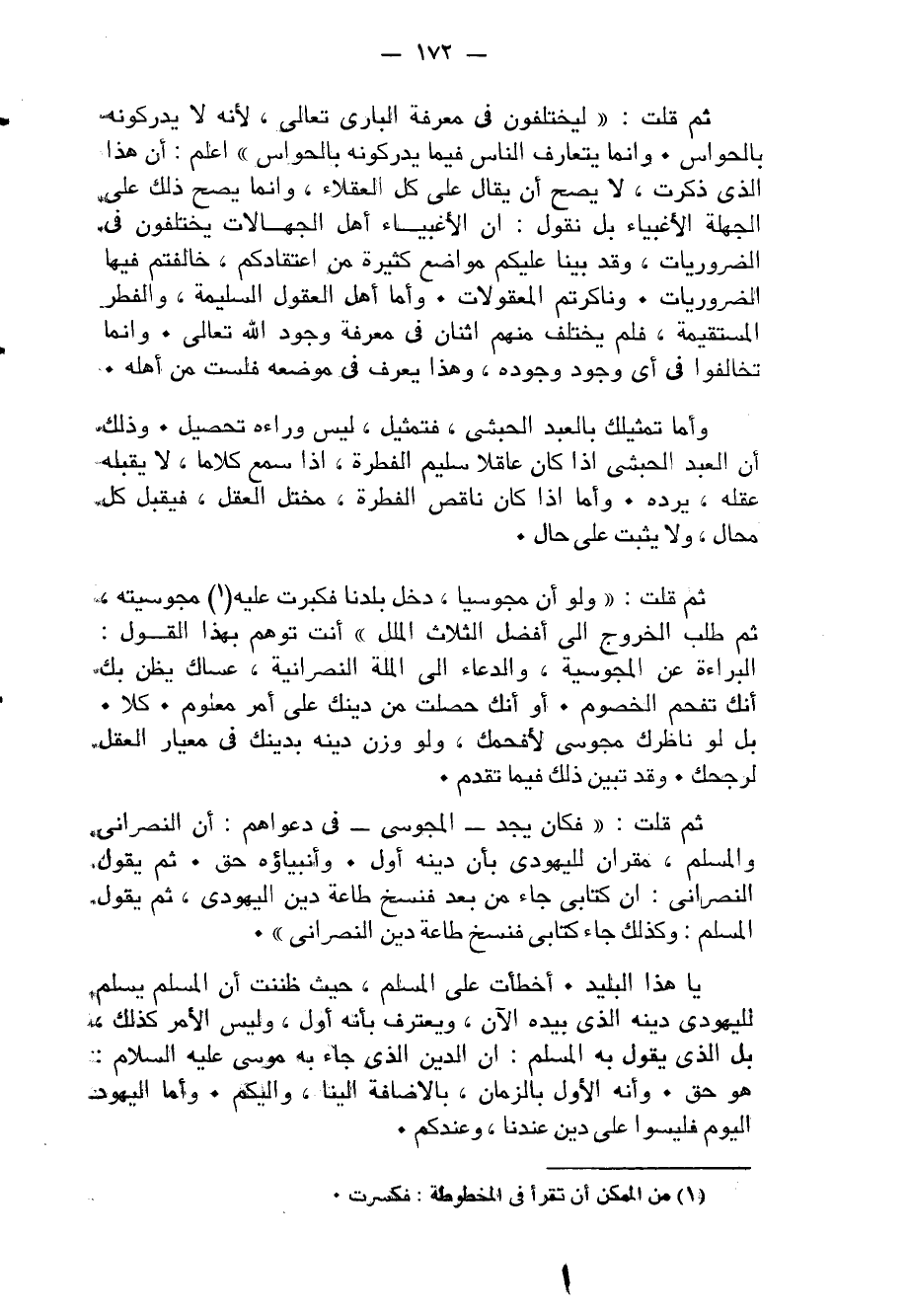 ثمَّ قلت وَلَو أَن مجوسيا دخل بلدنا فكبرت عَلَيْهِ مجوسيته ثمَّ طلب الْخُرُوج إِلَى أفضل الثَّلَاث الْملَل أَنْت توهم بِهَذَا القَوْل الْبَرَاءَة عَن الْمَجُوسِيَّة وَالدُّعَاء إِلَى الْملَّة النَّصْرَانِيَّة عساك يظنّ بك أَنَّك تفحم الْخُصُوم أَو أَنَّك حصلت من دينك على أَمر مَعْلُوم كلا بل لَو ناظرك مجوسى لأفحمك وَلَو وزن دينه بِدينِك فِي معيار الْعقل لرجحك وَقد تبين ذَلِك فِيمَا تقدم
