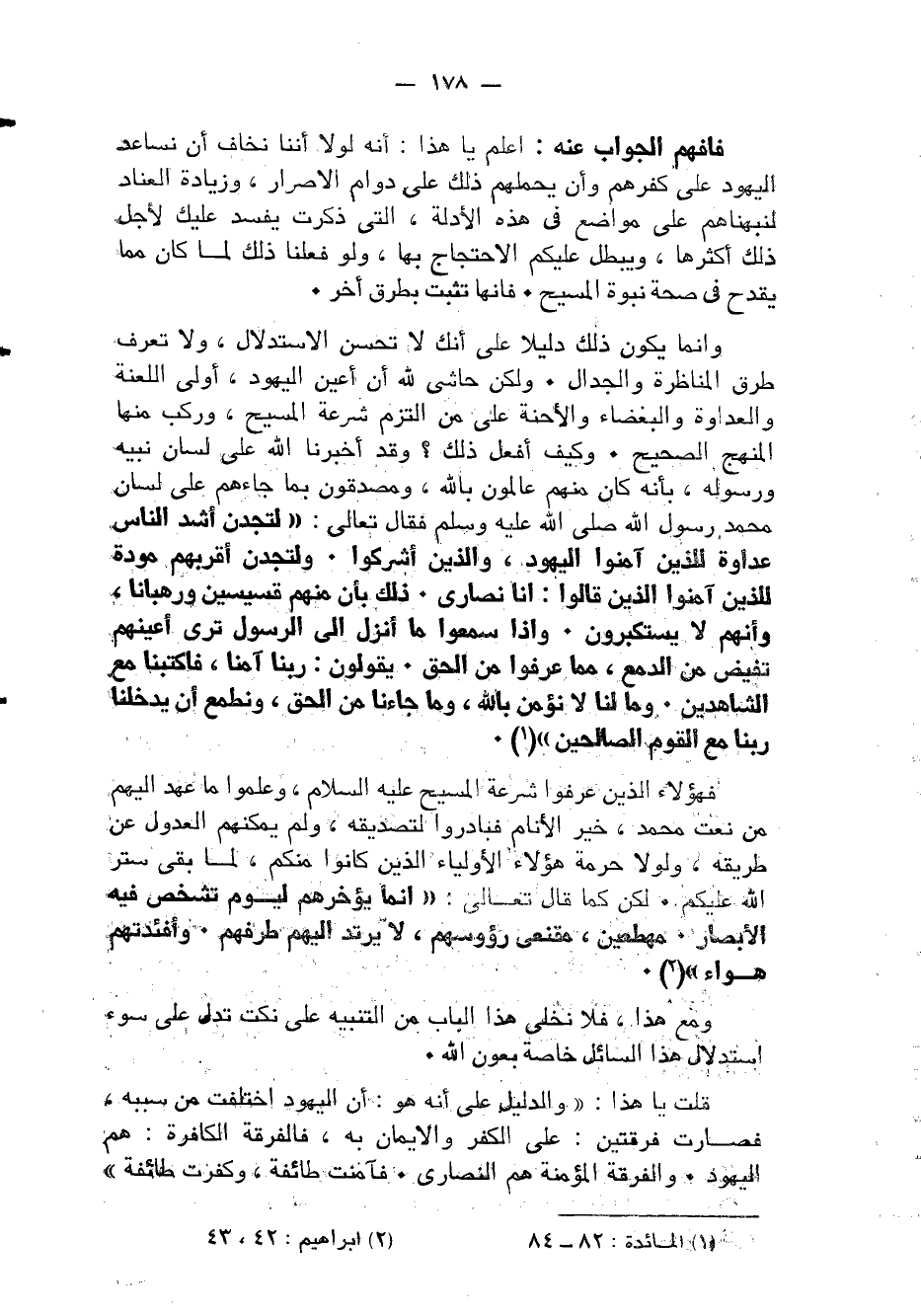 وَإِنَّمَا يكون ذَلِك دَلِيلا على أَنَّك لَا تحسن الإستدلال وَلَا تعرف طرق المناظرة والجدال وَلَكِن حاشى لله أَن أعين الْيَهُود أولى اللَّعْنَة والعداوة والبغضاء والأحنة على من الْتزم شرعة الْمَسِيح وَركب مِنْهَا الْمنْهَج الصَّحِيح وَكَيف أفعل ذَلِك وَقد أخبرنَا الله على لِسَان نبيه وَرَسُوله بِأَنَّهُ كَانَ مِنْهُم عالمون بِاللَّه ومصدقون بِمَا جَاءَهُم على لِسَان مُحَمَّد رَسُول الله صلى الله عَلَيْهِ وَسلم فَقَالَ تَعَالَى {لتجدن أَشد النَّاس عَدَاوَة للَّذين آمنُوا الْيَهُود وَالَّذين أشركوا ولتجدن أقربهم مَوَدَّة للَّذين آمنُوا الَّذين قَالُوا إِنَّا نَصَارَى ذَلِك بِأَن مِنْهُم قِسِّيسِينَ وَرُهْبَانًا وَأَنَّهُمْ لَا يَسْتَكْبِرُونَ وَإِذا سمعُوا مَا أنزل إِلَى الرَّسُول ترى أَعينهم تفيض من الدمع مِمَّا عرفُوا من الْحق يَقُولُونَ رَبنَا آمنا فاكتبنا مَعَ الشَّاهِدين وَمَا لنا لَا نؤمن بِاللَّه وَمَا جَاءَنَا من الْحق ونطمع أَن يدخلنا رَبنَا مَعَ الْقَوْم الصَّالِحين}