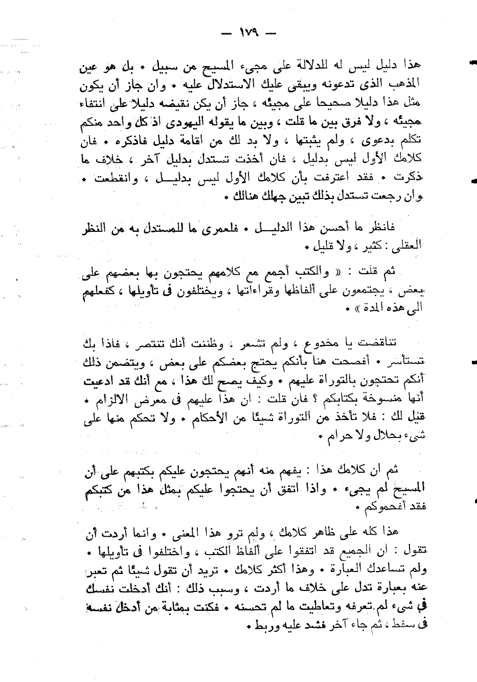 ثمَّ إِن كلامك هَذَا يفهم مِنْهُ أَنهم يحتجون عَلَيْكُم بكتبهم على أَن الْمَسِيح لم يَجِيء وَإِذا اتّفق أَن يحتجوا عَلَيْكُم بِمثل هَذَا من كتبكم فقد أفحموكم