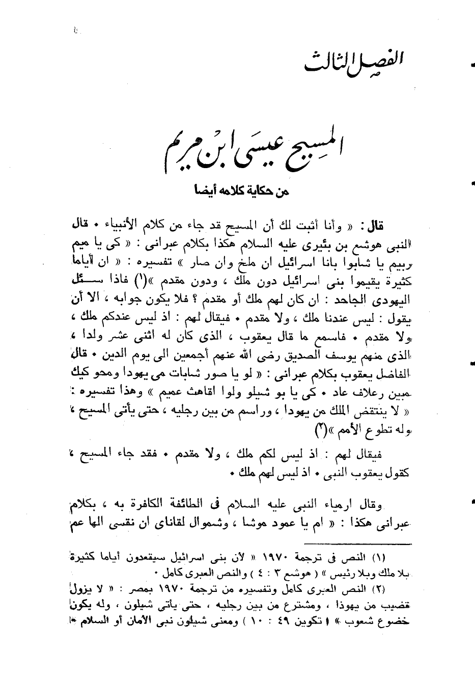 وَأَنا أثبت لَك أَن الْمَسِيح قد جَاءَ من كَلَام الْأَنْبِيَاء قَالَ النَّبِي هوشع بن بئيرى عَلَيْهِ السَّلَام هَكَذَا بِكَلَام عبراني كي يَا مِيم ربيم يَا شابوا بِأَنا إسرائل أَن ملخ وَإِن صَار تَفْسِيره إِن أَيَّامًا كَثِيرَة يقيموا بنى إِسْرَائِيل دون ملك وَدون مقدم فَإِذا سُئِلَ الْيَهُودِيّ الجاحد إِن كَانَ لَهُم ملك أَو مقدم فَلَا يكون جَوَابه إِلَّا أَن يَقُول لَيْسَ عندنَا ملك وَلَا مقدم فَيُقَال لَهُم إِذْ لَيْسَ عنْدكُمْ ملك وَلَا مقدم فاسمع مَا قَالَ يَعْقُوب الَّذِي كَانَ لَهُ اثنى عشر ولدا الَّذِي مِنْهُم يُوسُف الصّديق رَضِي الله عَنْهُم أَجْمَعِينَ إِلَى يَوْم الدّين قَالَ الْفَاضِل يَعْقُوب بِكَلَام عبراني لَو يَا صور شابات مى يهودا ومحو كيك مُبين رعلاف عَاد كى يَا بوشيلو ولوا اقاهث عميم وَهَذَا تَفْسِيره لَا ينْتَقض الْملك من يهودا وراسم من بَين رجلَيْهِ حَتَّى يأتى الْمَسِيح وَله تطوع الْأُمَم