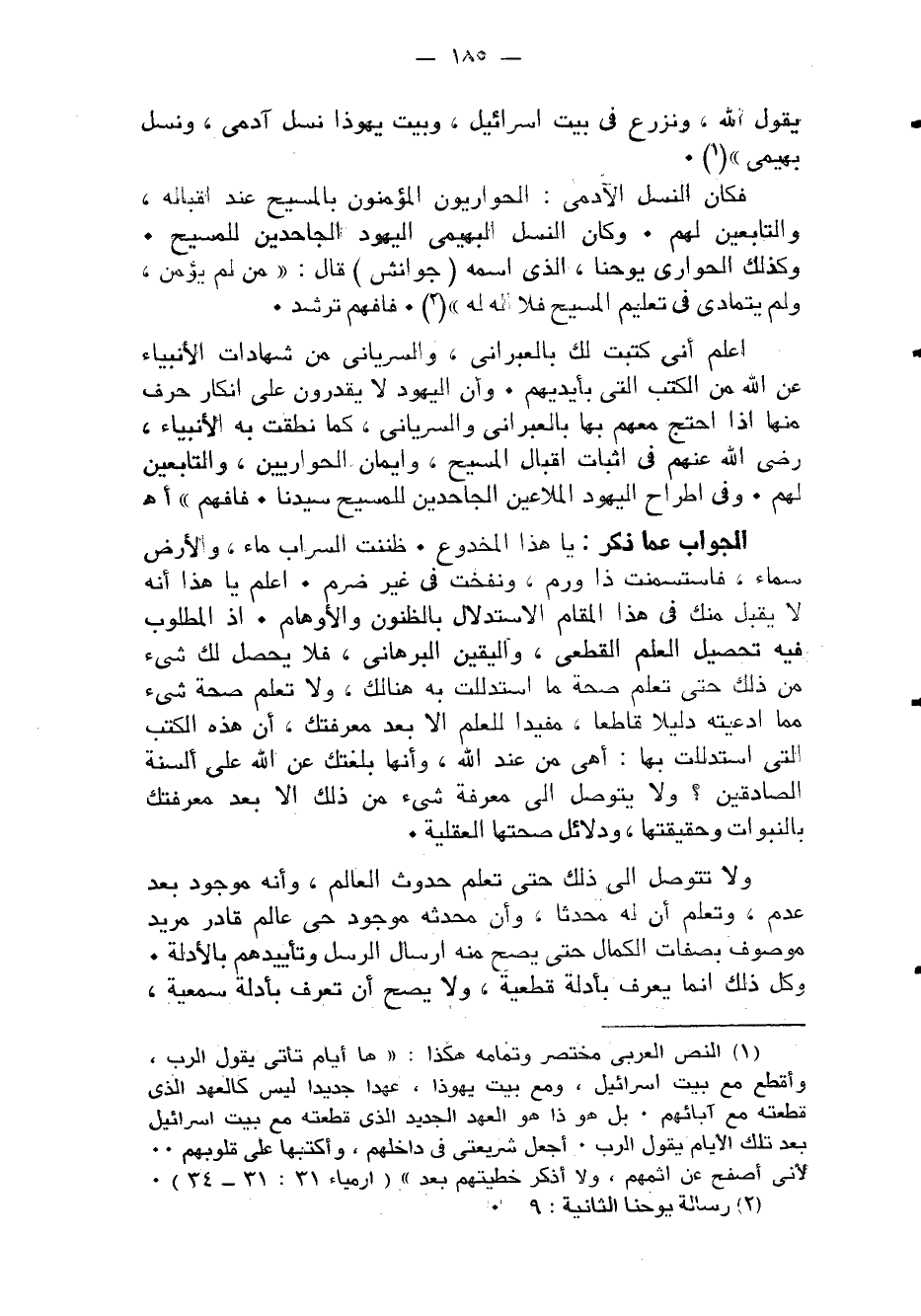 اعْلَم أَنِّي كتبت لَك بالعبراني والسرياني من شَهَادَات الْأَنْبِيَاء عَن الله من الْكتب الَّتِي بِأَيْدِيهِم وَأَن الْيَهُود لَا يقدرُونَ على إِنْكَار حرف مِنْهَا إِذا احْتج مَعَهم بهَا بالعبراني والسرياني كَمَا نطقت بِهِ الْأَنْبِيَاء رَضِي الله عَنْهُم فِي إِثْبَات إقبال الْمَسِيح وإيمان الحواريين وَالتَّابِعِينَ لَهُم وَفِي إطراح الْيَهُود الملاعين الجاحدين للمسيح سيدنَا فأفهم