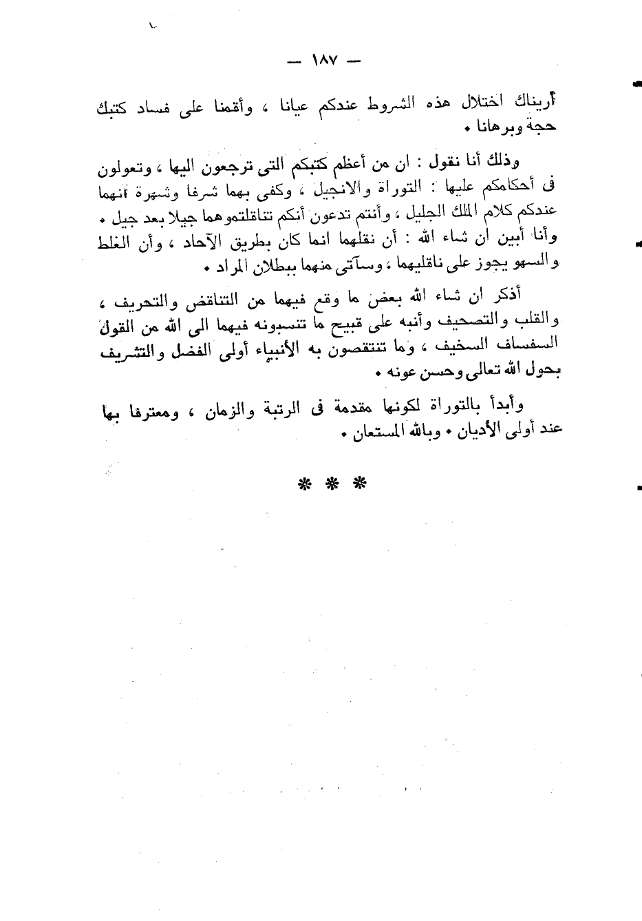 وَذَلِكَ أَنا نقُول إِن من أعظم كتبكم الَّتِي ترجعون إِلَيْهَا وتعولون فِي أحكامكم عَلَيْهَا التَّوْرَاة وَالْإِنْجِيل وَكفى بهما شرفا وشهرة أَنَّهُمَا عنْدكُمْ كَلَام الْملك الْجَلِيل وَأَنْتُم تدعون أَنكُمْ تناقلتموهما جيلا بعد جيل وَأَنا أبين إِن شَاءَ الله أَن نقلهما إِنَّمَا كَانَ بطرِيق الْآحَاد وَأَن الْغَلَط والسهو يجوز على ناقليهما وسآتي مِنْهُمَا بِبُطْلَان المُرَاد