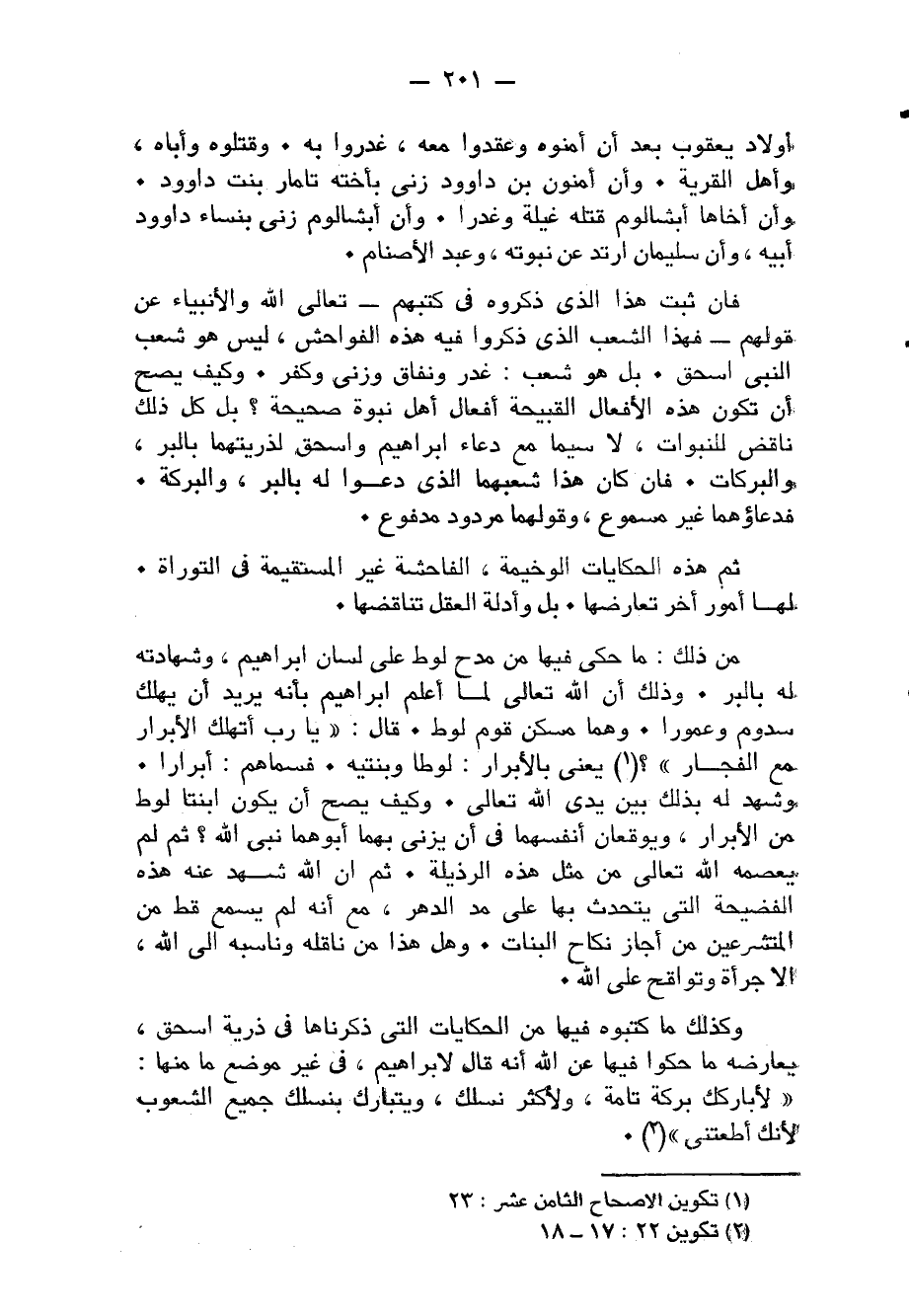 ثمَّ هَذِه الحكايات الوخيمة الْفَاحِشَة غير المستقيمة فِي التَّوْرَاة لَهَا أُمُور أخر تعارضها بل وأدلة الْعقل تناقضها
