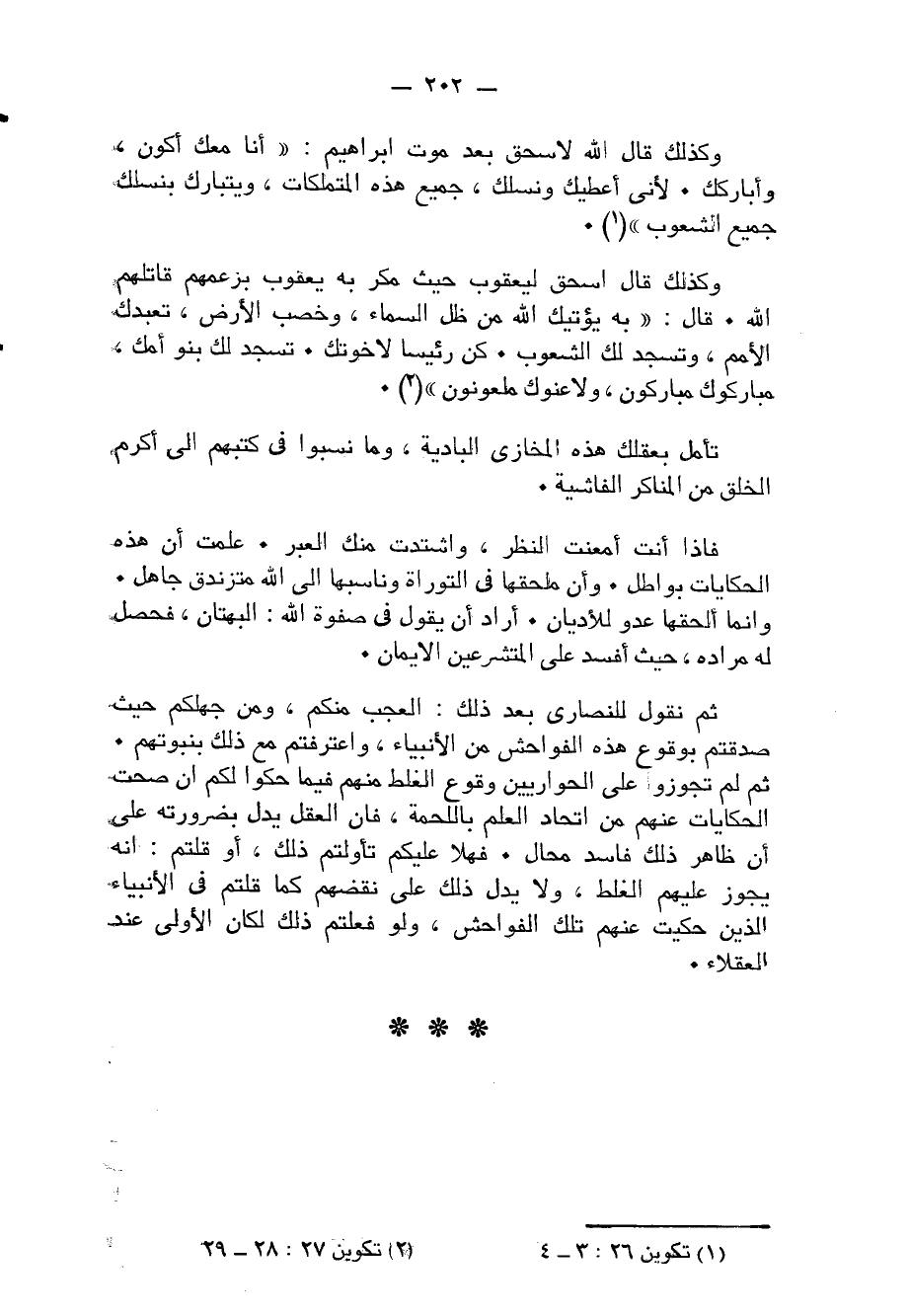 فَإِذا أَنْت أمعنت النّظر وأشتدت مِنْك العبر علمت أَن هَذِه الحكايات بواطل وَأَن مُلْحَقهَا فِي التَّوْرَاة وناسبها إِلَى الله متزندق جَاهِل وَإِنَّمَا ألحقها عَدو للأديان أَرَادَ أَن يَقُول فِي صفوة الله الْبُهْتَان فَحصل لَهُ مُرَاده حَيْثُ أفسد على المتشرعين الْإِيمَان