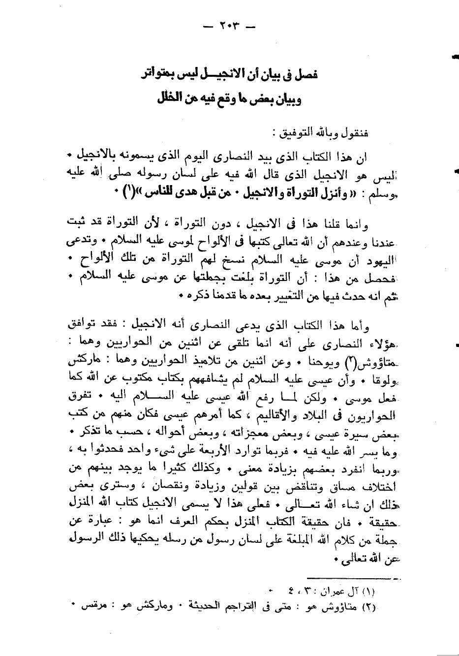وَأما هَذَا الْكتاب الَّذِي يدعى النَّصَارَى أَنه الْإِنْجِيل فقد توَافق هَؤُلَاءِ النَّصَارَى على أَنه إِنَّمَا تلقى عَن إثنين من الحواريين وهما متاؤوش ويوحنا وَعَن اثْنَيْنِ من تلاميذ الحواريين وهما ماركش ولوقا وَأَن عِيسَى عَلَيْهِ السَّلَام لم يشافههم بِكِتَاب مَكْتُوب عَن الله كَمَا فعل مُوسَى وَلَكِن لما رفع الله عِيسَى عَلَيْهِ السَّلَام إِلَيْهِ تفرق الحواريون فِي الْبِلَاد والأقاليم كَمَا أَمرهم عِيسَى فَكَانَ مِنْهُم من كتب بعض سيرة عِيسَى وَبَعض معجزاته وَبَعض أَحْوَاله حسب مَا تذكر وَمَا يسر الله عَلَيْهِ فِيهِ فَرُبمَا توارد الْأَرْبَعَة على شَيْء وَاحِد فَحَدثُوا بِهِ وَرُبمَا انْفَرد بَعضهم بِزِيَادَة معنى وَكَذَلِكَ كثيرا مَا يُوجد بَينهم من اخْتِلَاف مساق وتناقض بَين قَوْلَيْنِ وَزِيَادَة ونقصان وسترى بعض ذَلِك إِن شَاءَ الله تَعَالَى فعلى هَذَا لايسمى الْإِنْجِيل كتاب الله الْمنزل حَقِيقَة فَإِن حَقِيقَة الْكتاب الْمنزل بِحكم الْعرف إِنَّمَا هُوَ عبارَة عَن جملَة من كَلَام الله المبلغة على لِسَان رَسُول من رسله يحكيها ذَلِك الرَّسُول عَن الله تَعَالَى