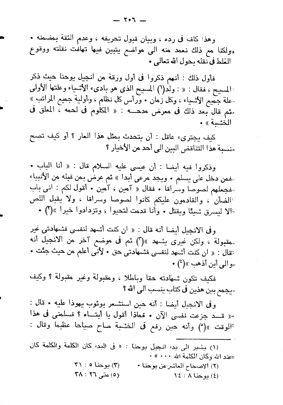 فَأول ذَلِك أَنهم ذكرُوا فِي أول ورقة من إنجيل يوحنا حَيْثُ ذكر الْمَسِيح فَقَالَ ولد الْمَسِيح الَّذِي هُوَ بادئ الْأَشْيَاء وعلتها الأولى عِلّة جَمِيع الْأَشْيَاء وكل زمَان وَرَأس كل نظام وأولية جَمِيع الْمَرَاتِب ثمَّ قَالَ بعد ذَلِك فِي معرض مدحه المكلوم فِي لَحْمه الْمُعَلق فِي الْخَشَبَة