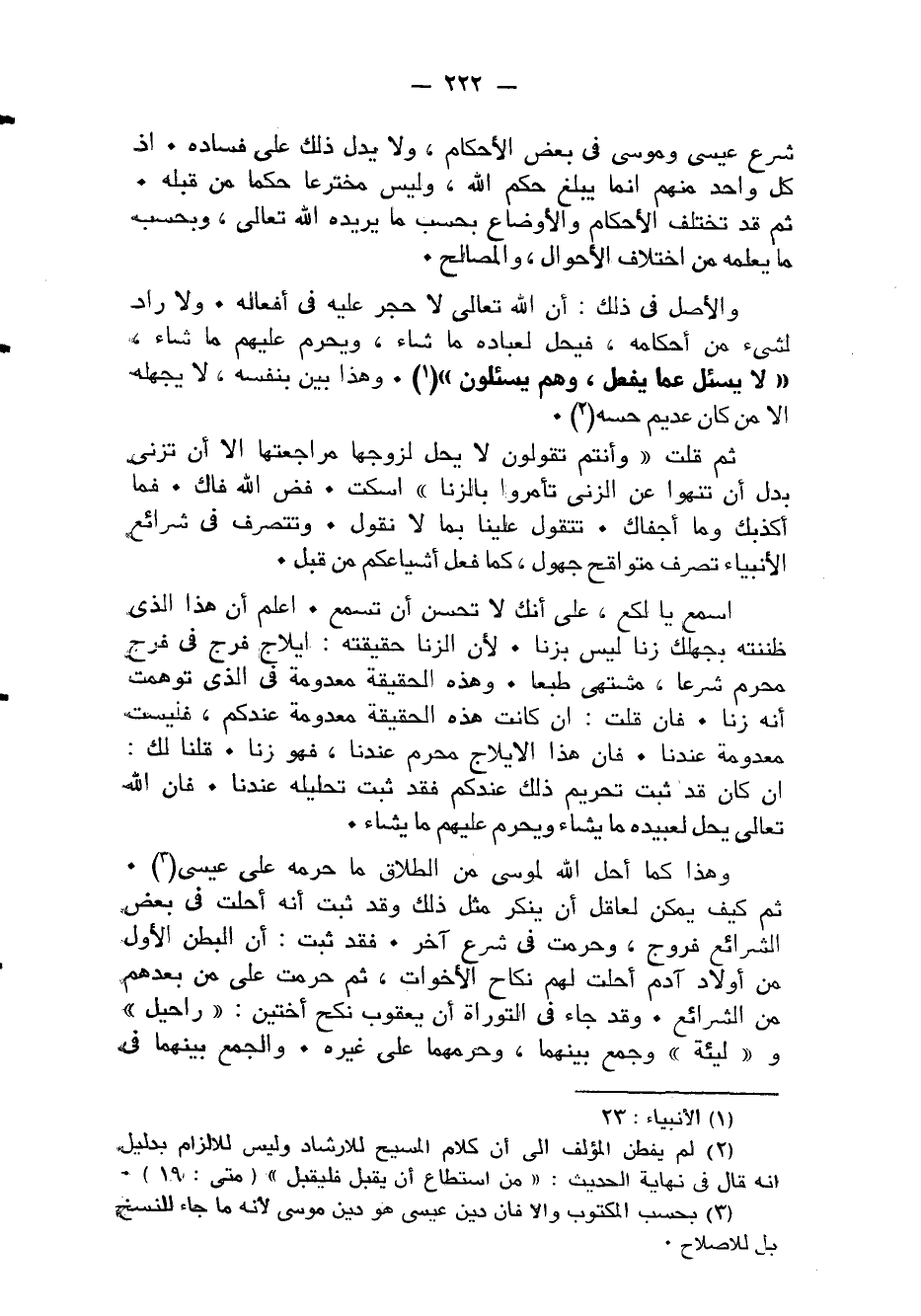 شرع عِيسَى ومُوسَى فِي بعض الْأَحْكَام وَلَا يدل ذَلِك على فَسَاده إِذْ كل وَاحِد مِنْهُم إِنَّمَا يبلغ حكم الله ولس مخترعا حكما من قبله ثمَّ قد تخْتَلف الْأَحْكَام والأوضاع بِحَسب مَا يُريدهُ الله تَعَالَى وبحسب مَا يُعلمهُ من إختلاف الْأَحْوَال 2 والمصالح