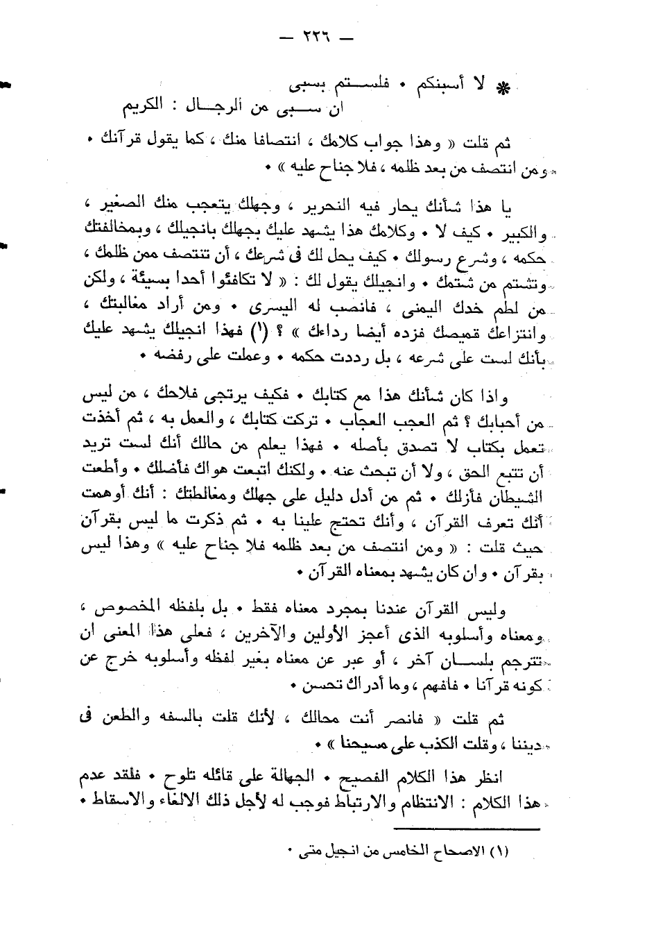 يَا هَذَا شَأْنك يحار فِيهِ النحرير وجهلك يتعجب مِنْك الصَّغِير وَالْكَبِير كَيفَ لَا وكلامك هَذَا يشْهد عَلَيْك بجهلك بإنجيلك وبمخالفتك حكمه وَشرع رَسُولك كَيفَ يحل لَك فِي شرعك أَن تنتصف مِمَّن ظلمك وتشتم من شتمك وإنجيلك يَقُول لَك لَا تكافئوا أحدا بسيئة وَلكم من لطم خدك الْيُمْنَى فانصب لَهُ الْيُسْرَى وَمن أَرَادَ مغالبتك وإنتزاعك قَمِيصك فزده أَيْضا رداءك فَهَذَا إنجيلك يشْهد عَلَيْك بأنك لست على شَرعه بل رددت حكمه وعملت على رفضه