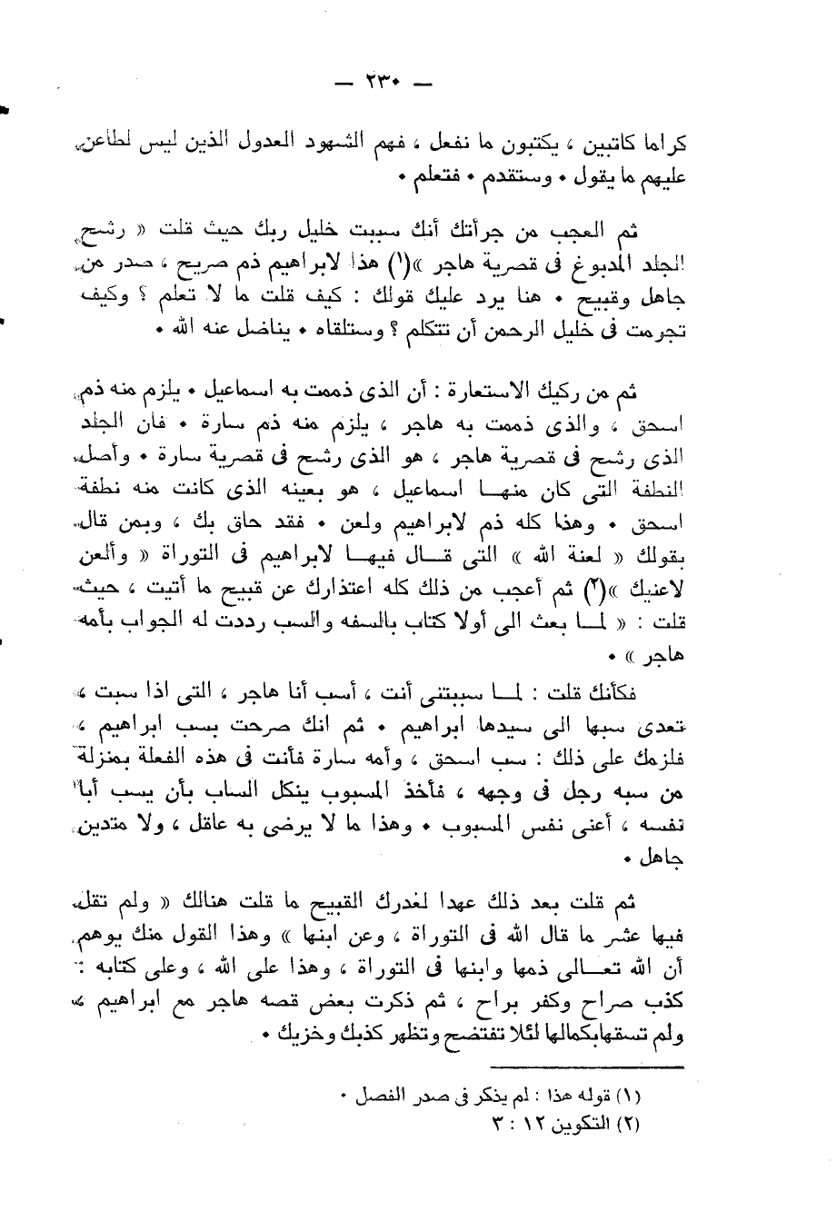 ثمَّ قلت بعد ذَلِك عهدا لغدرك الْقَبِيح مَا قلت هُنَالك وَلم تقل فِيهَا عشر مَا قَالَ الله فِي التَّوْرَاة وَعَن إبنها وَهَذَا القَوْل مِنْك يُوهم أَن الله تَعَالَى ذمها وإبنها فِي التَّوْرَاة وَهَذَا على الله وعَلى كِتَابه كذب صراح وَكفر براح ثمَّ ذكرت بعض قصه هَاجر مَعَ إِبْرَاهِيم وَلم تسقها بكمالها لِئَلَّا تفتضح وَتظهر كَذبك وخزيك