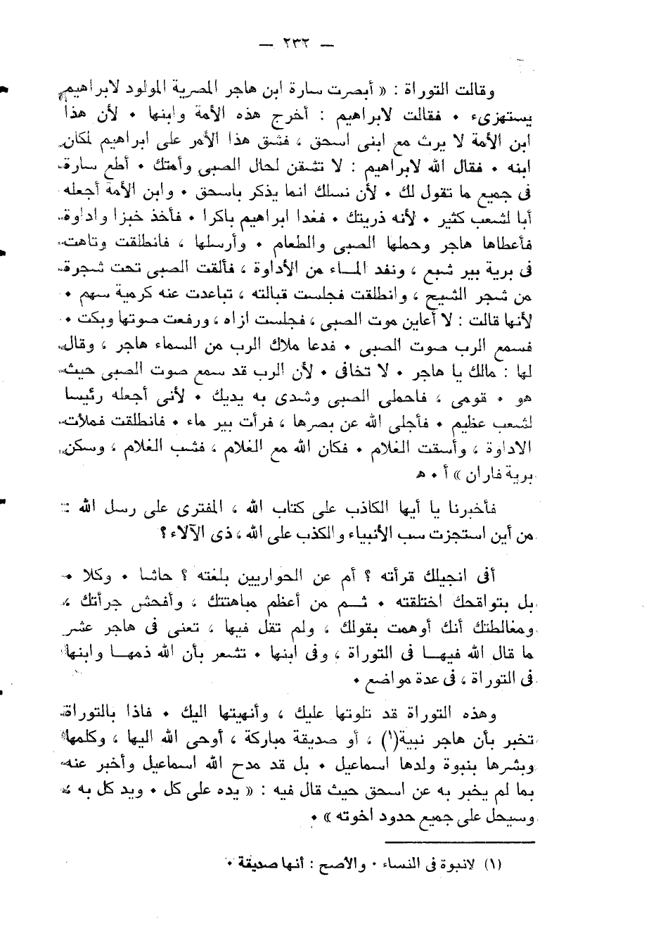 وَهَذِه التَّوْرَاة قد تلوتها عَلَيْك وأنهيتها إِلَيْك فَإِذا بِالتَّوْرَاةِ تخبر بِأَن هَاجر نبية أَو صديقَة مباركة أوحى الله إِلَيْهَا وكلمها وبشرها بنبوة وَلَدهَا إِسْمَاعِيل بل قد مدح الله إِسْمَاعِيل وَأخْبر عَنهُ بِمَا لم يخبر بِهِ عَن إِسْحَق حَيْثُ قَالَ فِيهِ يَده على كل وَيَد كل بِهِ وسيحل على جَمِيع حُدُود إخْوَته