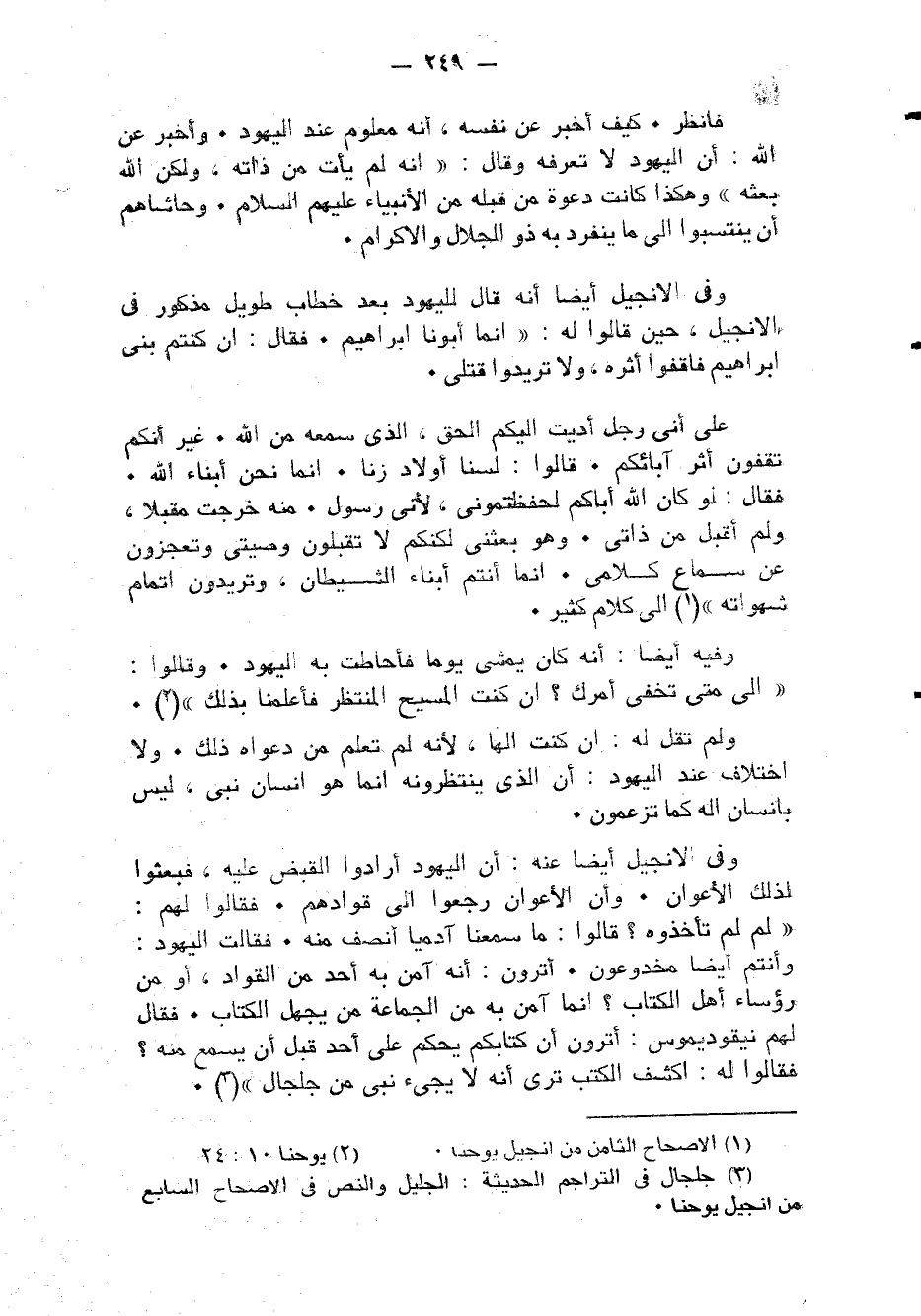 وَفِي الْإِنْجِيل أَيْضا أَنه قَالَ للْيَهُود بعد خطاب طَوِيل مَذْكُور فِي الْإِنْجِيل حِين قَالُوا لَهُ إِنَّمَا أَبونَا إِبْرَاهِيم فَقَالَ إِن كُنْتُم بني إِبْرَاهِيم فاقفوا أَثَره وَلَا تريدوا قَتْلِي