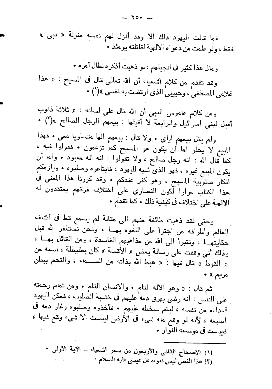 وَلم يقل بيعهم إيَّايَ وَلَا قَالَ بيعهم إِلَهًا مُتَسَاوِيا معي فَهَذَا الْمَبِيع لَا يَخْلُو أما أَن يكون هُوَ الْمَسِيح كَمَا تَزْعُمُونَ فَقولُوا فِيهِ كَمَا قَالَ الله أَنه رجل صَالح وَلَا تَقولُوا إِنَّه إِلَه معبود وَأما أَن يكون الْمَبِيع غَيره فَهُوَ الَّذِي شبه للْيَهُود فابتاعوه وصلبوه ويلزمكم إِنْكَار صلوبية الْمَسِيح وَهُوَ كفر عنْدكُمْ وَقد كررنا هَذَا الْمَعْنى فِي هَذَا الْكتاب مرَارًا لكَون النَّصَارَى على إختلاف فرقهم يَعْتَقِدُونَ لَهُ الإلهية على إختلاف فِي كَيْفيَّة ذَلِك كَمَا تقدم