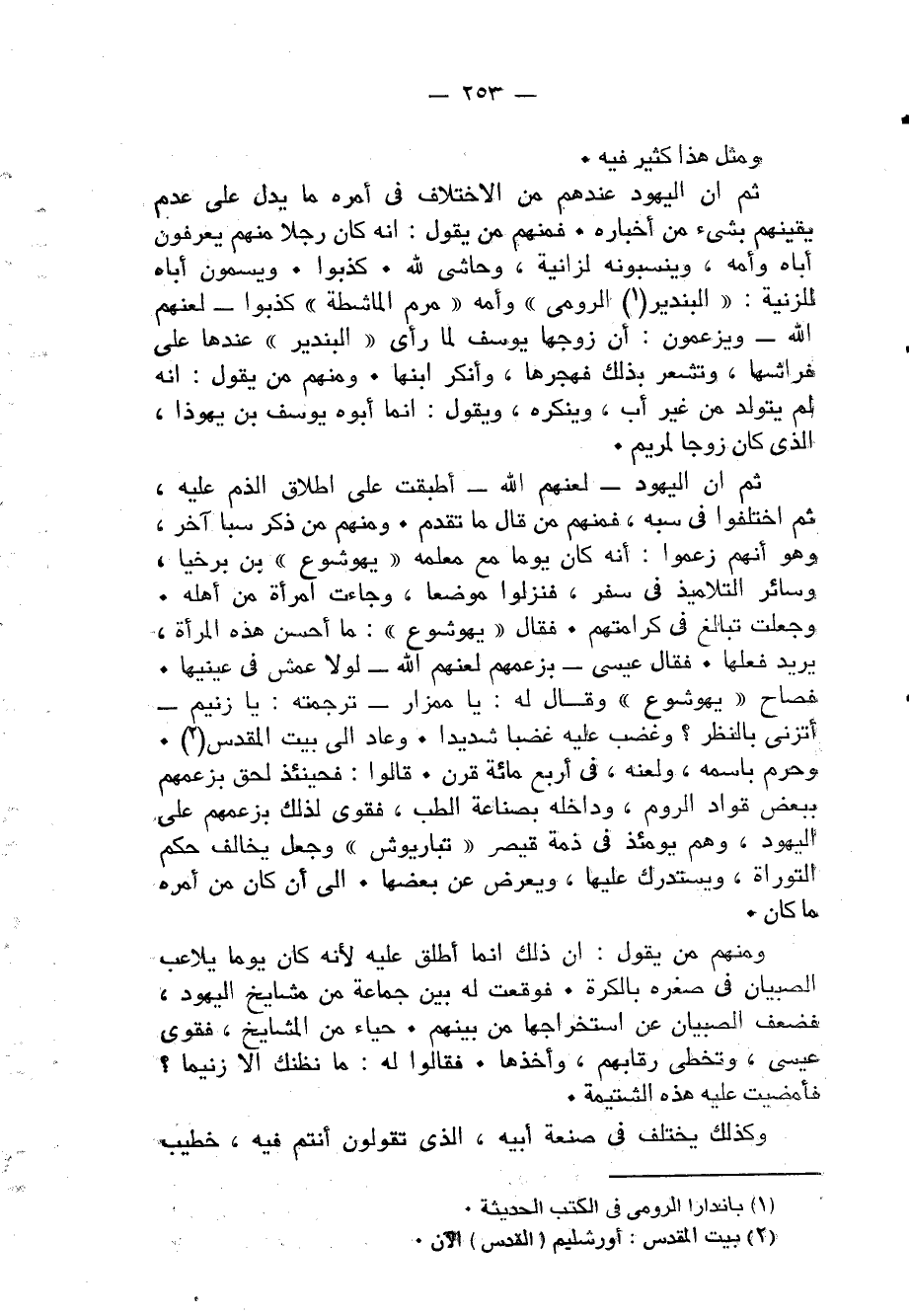 ثمَّ إِن الْيَهُود عِنْدهم من الإختلاف فِي أمره مَا يدل على عدم يقينهم بِشَيْء من أخباره فَمنهمْ من يَقُول إِنَّه كَانَ رجلا مِنْهُم يعْرفُونَ أَبَاهُ وَأمه وينسبونه لزانية وحاشى لله كذبُوا ويسمون أَبَاهُ للزنية البندير الرُّومِي وَأمه مرم الماشطة كذبُوا لعنهم الله ويزعمون أَن زَوجهَا يُوسُف لما رأى البندير عَنْهَا على فراشها وتشعر بذلك فهجرها وَأنكر إبنها وَمِنْهُم من يَقُول أَنه لم يتَوَلَّد من غير أَب وينكره وَيَقُول إِنَّمَا أَبوهُ يُوسُف بن يهوذا الَّذِي كَانَ زوجا لِمَرْيَم