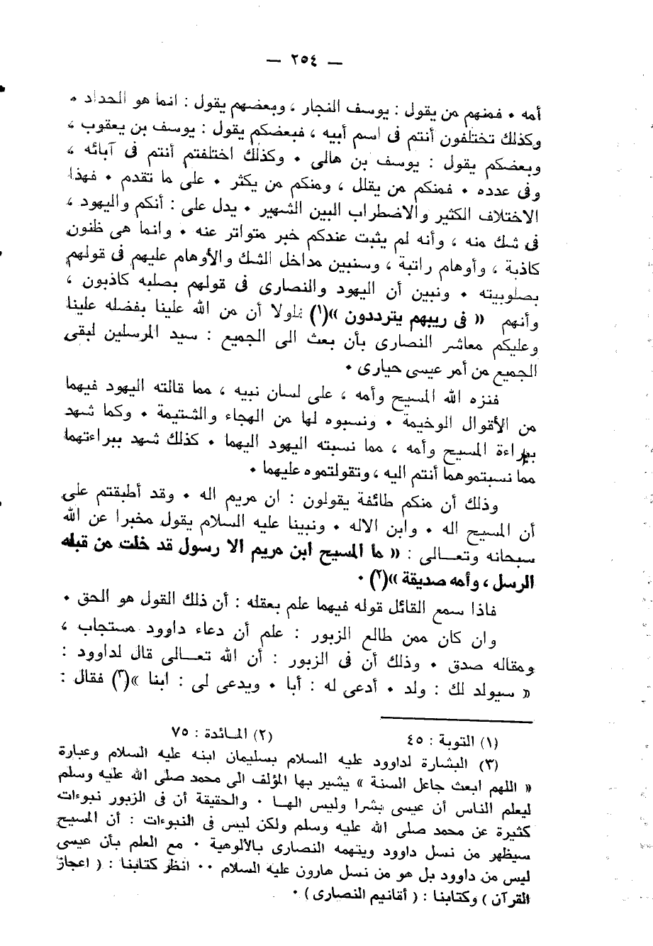 أمه فَمنهمْ من يَقُول يُوسُف النجار وَبَعْضهمْ يَقُول إِنَّمَا هُوَ الْحداد وَكَذَلِكَ تختلفون أَنْتُم فِي إسم أَبِيه فبعضكم يَقُول يُوسُف بن يَعْقُوب وبعضكم يَقُول يُوسُف بن هالى وَكَذَلِكَ اختلفتم أَنْتُم فِي آبَائِهِ وَفِي عدده فمنكم من يقلل ومنكم من يكثر على مَا تقدم فَهَذَا الإختلاف الْكثير والإضطراب الْبَين الشهير يدل على أَنكُمْ وَالْيَهُود فِي شكّ مِنْهُ وَأَنه لم يثبت عنْدكُمْ خبر متواتر عَنهُ وَإِنَّمَا هِيَ ظنون كَاذِبَة وأوهام راتبة وسنبين مدَاخِل الشَّك والأوهام عَلَيْهِم فِي قَوْلهم بصلوبيته ونبين أَن الْيَهُود وَالنَّصَارَى فِي قَوْلهم بصلبه كاذبون وَأَنَّهُمْ {فِي ريبهم يَتَرَدَّدُونَ} فلولا أَن من الله علينا بفضله علينا وَعَلَيْكُم معاشر النَّصَارَى بِأَن بعث إِلَى الْجَمِيع سيد الْمُرْسلين لبقى الْجَمِيع من أَمر عِيسَى حيارى