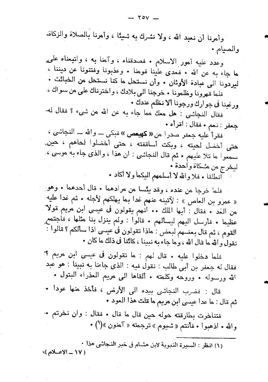 فَلَمَّا دخلُوا عَلَيْهِ قَالَ لَهُم مَا تَقولُونَ فِي عِيسَى ابْن مَرْيَم فَقَالَ لَهُ جَعْفَر بن أبي طَالب نقُول فِيهِ الَّذِي جَاءَنَا بِهِ نَبينَا هُوَ عبد الله وَرَسُوله وروحه وكلمته أَلْقَاهَا إِلَى مَرْيَم الْعَذْرَاء البتول