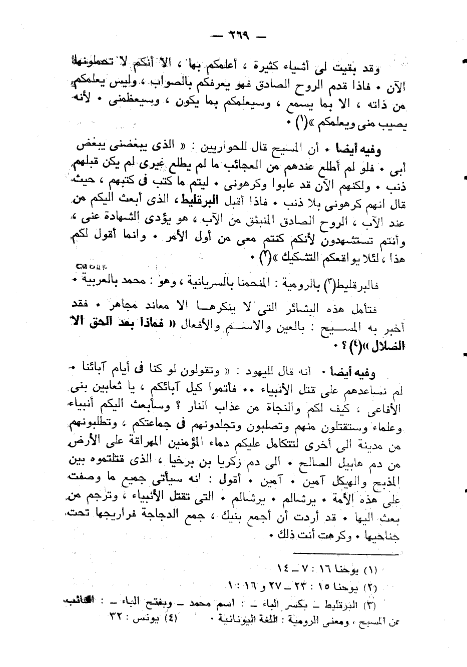 أَن الْمَسِيح قَالَ للحواريين الَّذِي يبغضني يبغض أبي فَلَو لم أطلع عِنْدهم من الْعَجَائِب مَا لم يطلع غَيْرِي لم يكن قبلهم ذَنْب وَلَكنهُمْ الْآن قد عابوا وكرهوني ليتم مَا كتب فِي كتبهمْ حَيْثُ قَالَ أَنهم كرهوني بِلَا ذَنْب فَإِذا أقبل البرقليط الَّذِي أبْعث إِلَيْكُم من عِنْد الآب الرّوح الصَّادِق المنبثق من الآب هُوَ يُؤَدِّي الشَّهَادَة عني وَأَنْتُم تستشهدون لأنكم كُنْتُم معي من أول الْأَمر وَإِنَّمَا أَقُول لكم هَذَا لِئَلَّا يواقعكم التشكيك