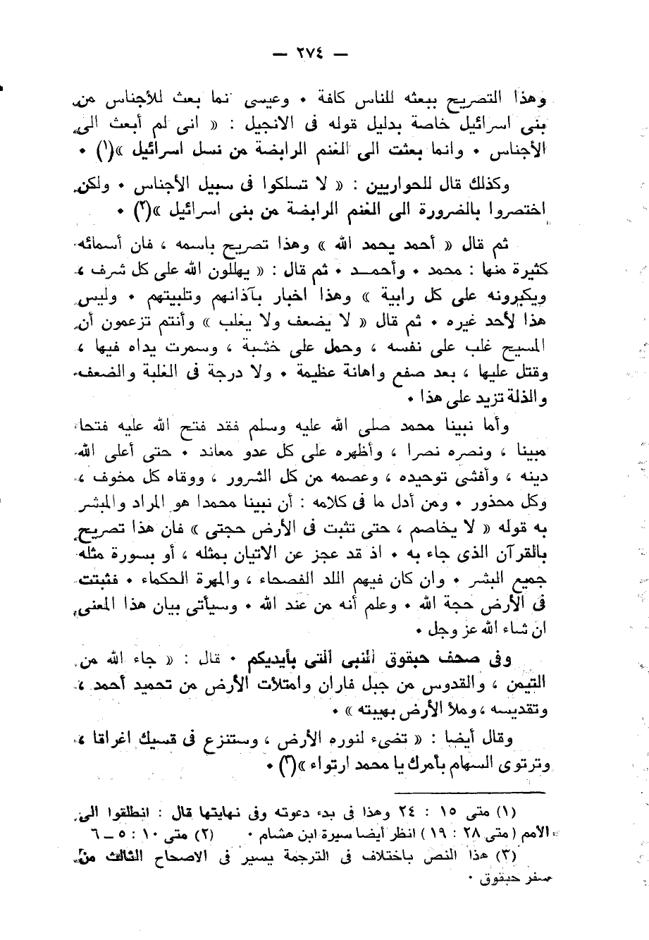 ثمَّ قَالَ أَحْمد يحمد الله وَهَذَا تَصْرِيح بإسمه فَإِن أَسْمَائِهِ كَثِيرَة مِنْهَا مُحَمَّد وَأحمد ثمَّ قَالَ يثللون الله على كل شرف ويكبرونه على كل رابية وَهَذَا إِخْبَار بآذانهم وتلبيتهم وَلَيْسَ هَذَا لأحد غَيره ثمَّ قَالَ لَا يضعف وَلَا يغلب وَأَنْتُم تَزْعُمُونَ أَن الْمَسِيح غلب على نَفسه وَحمل على خَشَبَة وسمرت يَدَاهُ فِيهَا وَقتل عَلَيْهَا بعد صفع وإهانة عَظِيمَة وَلَا دَرَجَة فِي الْغَلَبَة والضعف والذلة تزيد على هَذَا