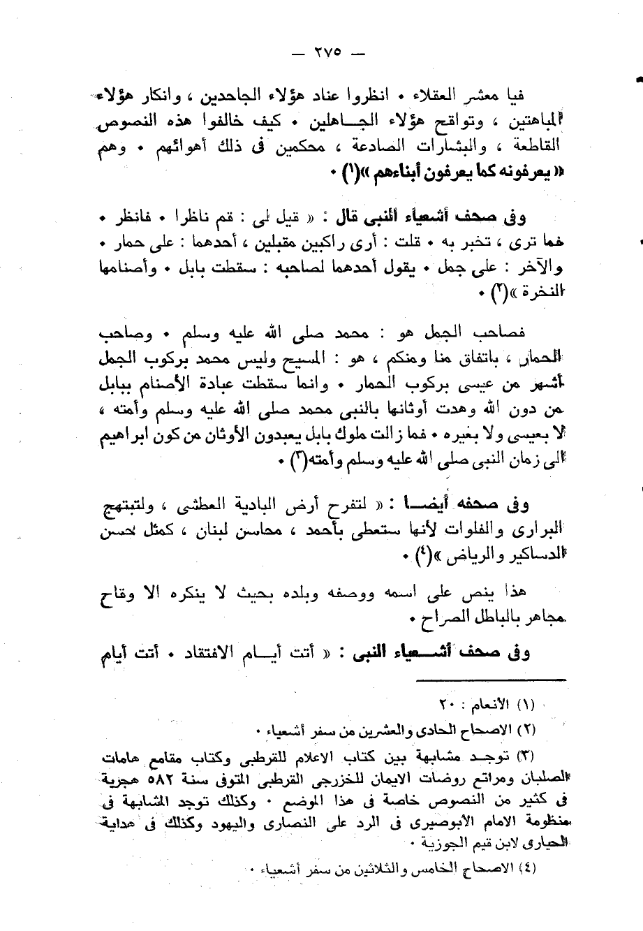 فيا معشر الْعُقَلَاء انْظُرُوا عناد هَؤُلَاءِ الجاحدين وإنكار هَؤُلَاءِ المباهتي وتواقح هَؤُلَاءِ الْجَاهِلين كَيفَ خالفوا هَذِه النُّصُوص القاطعة والبشارات الصادعة محكمين فِي ذَلِك أهوائهم وهم {يعرفونه كَمَا يعْرفُونَ أَبْنَاءَهُم}