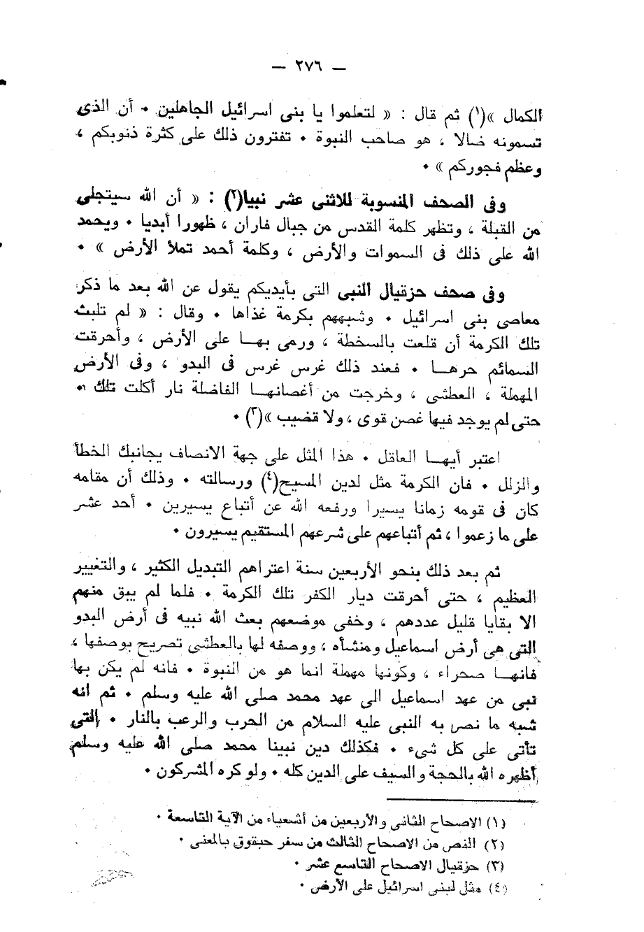 ثمَّ بعد ذَلِك بِنَحْوِ الْأَرْبَعين سنة إعتراهم التبديل الْكثير والتغيير الْعَظِيم حَتَّى أحرقت ديار الْكفْر تِلْكَ الكرمة فَلَمَّا لم يبْق مِنْهُم إِلَّا بقايا قَلِيل عَددهمْ وخفى موضعهم بعث الله نبيه فِي أَرض البدو الَّتِي هِيَ أَرض إِسْمَاعِيل ومنشأه وَوَصفه لَهَا بالعطشى تَصْرِيح بوصفها فَإِنَّهُ صحراء وَكَونهَا مُهْملَة إِنَّمَا هُوَ من النُّبُوَّة فَإِنَّهُ لم يكن بهَا نَبِي من عهد إِسْمَاعِيل إِلَى عهد مُحَمَّد صلى الله عَلَيْهِ وَسلم ثمَّ أَنه شبه مَا نصر بِهِ النَّبِي عَلَيْهِ وَالسَّلَام من الْحَرْب والرعب بالنَّار الَّتِي تَأتي على كل شَيْء فَكَذَلِك دين نَبينَا مُحَمَّد صلى الله عَلَيْهِ وَسلم أظهره الله بِالْحجَّةِ وَالسيف على الدّين كُله وَلَو كره الْمُشْركُونَ