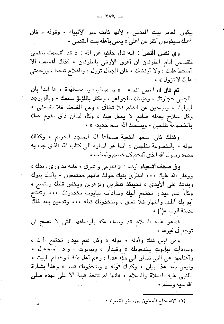 وَمن أبين ذَلِك وأدله قَوْله وكل غنم قيدار تَجْتَمِع إِلَيْك وسادات بنايوت يخدمونك وقيدار ونبايوت ولدا إِسْمَاعِيل وأغنامهم هِيَ الَّتِي تساق إِلَى مَكَّة هَديا وهم أهل مَكَّة وخدام الْبَيْت وَلَيْسَ بعد هَذَا بَيَان وَكَذَلِكَ قَوْله ويتخذونك قبْلَة وَهَذَا بِشَارَة بِالنَّبِيِّ عَلَيْهِ الصَّلَاة وَالسَّلَام فَإِنَّهَا لم تتَّخذ قبْلَة إِلَّا على عَهده صلى الله عَلَيْهِ وَسلم