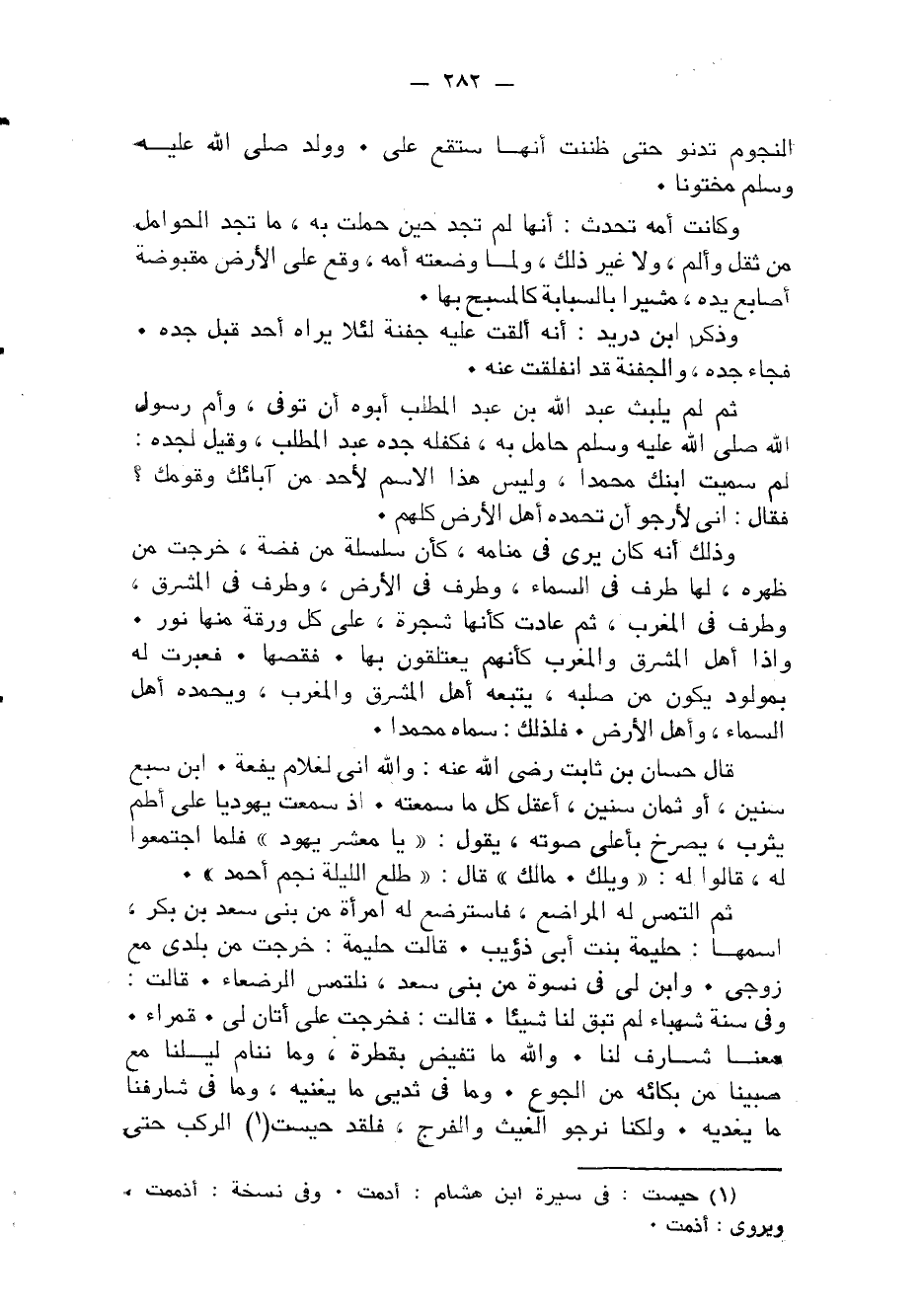 ثمَّ التمس لَهُ المراضع فاسترضع لَهُ امراة من بني سعد بن بكر إسمها حليمة بنت أبي ذُؤَيْب قَالَت حليمة خرجت من بلدي مَعَ زَوجي وَابْن لي فِي نسْوَة من بني سعد نلتمس الرضعاء قَالَت وَفِي سنة شهباء لم تبْق لنا شَيْئا قَالَت فَخرجت على أتان لي قَمْرَاء مَعنا شَارف لنا وَالله مَا تفيض بقطرة وَمَا ننام ليلنا مَعَ صبينا من بكائه من الْجُوع وَمَا فِي ثديي مَا يُغْنِيه وَمَا فِي شارفنا مَا يغديه وَلَكنَّا نرجو الْغَيْث والفرج فَلَقَد حيست الركب حَتَّى