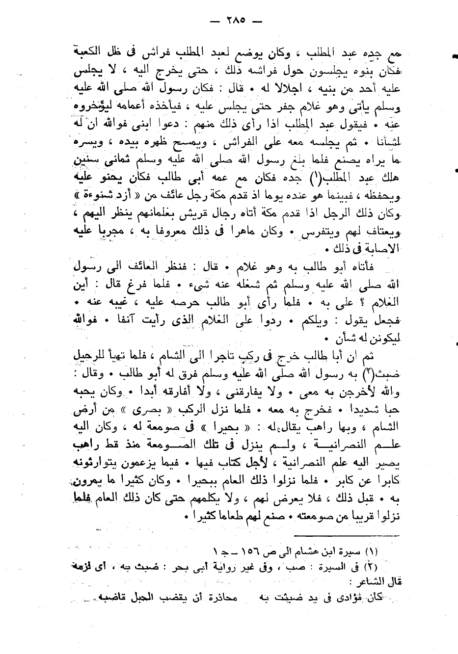 ثمَّ إِن أَبَا طَالب خرج فِي ركب تَاجِرًا إِلَى الشَّام فَلَمَّا تهَيَّأ للرحيل ضبث بِهِ رَسُول الله صلى الله عَلَيْهِ وَسلم فرق لَهُ أَبُو طَالب وَقَالَ وَالله لأخْرجَن بِهِ معي وَلَا يفارقني وَلَا أفارقه أبدا وَكَانَ يُحِبهُ حبا شَدِيدا فَخرج بِهِ مَعَه فَلَمَّا نزل الركب بصرى من أَرض الشَّام وَبهَا رَاهِب يُقَال لَهُ بخيرا فِي صومعة لَهُ وَكَانَ إِلَيْهِ علم النَّصْرَانِيَّة وَلم ينزل فِي تِلْكَ الصومعة مُنْذُ قطّ رَاهِب يصير إِلَيْهِ علم النَّصْرَانِيَّة لأجل كتاب فِيهَا فِيمَا يَزْعمُونَ يتوارثونه كَابِرًا عَن كَابر فَلَمَّا نزلُوا ذَلِك الْعَام ببحيرا وَكَانَ كثيرا مَا يَمرونَ بِهِ قبل ذَلِك فَلَا يعرض لَهُم وَلَا يكلمهم حَتَّى كَانَ ذَلِك الْعَام فَلَمَّا نزلُوا قَرِيبا من صومعته صنع لَهُم طَعَاما كثيرا