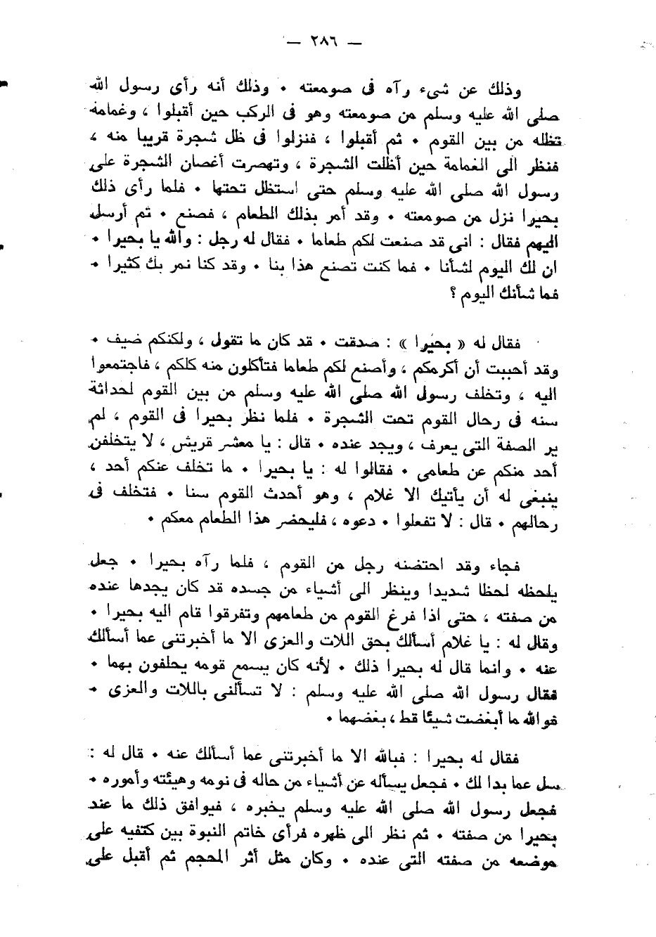 فجَاء وَقد احتضنه رجل من الْقَوْم فَلَمَّا رَآهُ بحيرا جعل يلحظه لحظا شَدِيدا وَينظر إِلَى أَشْيَاء من جسده قد كَانَ يجدهَا عِنْده من صفته حَتَّى إِذا فرغ الْقَوْم من طعامهم وَتَفَرَّقُوا قَامَ إِلَيْهِ بحيرا وَقَالَ لَهُ يَا غُلَام أَسأَلك بِحَق اللات والعزى أَلا مَا أَخْبَرتنِي عَمَّا أَسأَلك عَنهُ وَإِنَّمَا قَالَ لَهُ بحيرا ذَلِك لِأَنَّهُ كَانَ يسمع قومه يحلفُونَ بهما فَقَالَ رَسُول الله صلى الله عَلَيْهِ وَسلم لَا تَسْأَلنِي بِاللات والعزى فوَاللَّه مَا أبغضت شَيْئا قطّ بغضهما