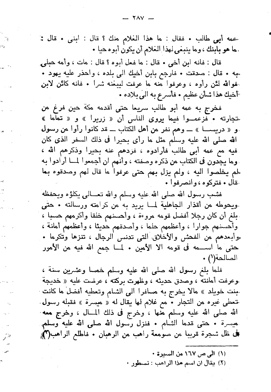 فَلَمَّا بلغ رَسُول الله صلى الله عَلَيْهِ وَسلم خمْسا وَعشْرين سنة وَعرفت أَمَانَته وَصدق حَدِيثه وَظَهَرت بركته عرضت عَلَيْهِ خَدِيجَة بنت خويلد مَا لَا يخرج بِهِ مُسَافِرًا إِلَى الشَّام وتعطيه أفضل مَا كَانَت تُعْطِي غَيره من التُّجَّار مَعَ غُلَام لَهَا يُقَال لَهُ ميسرَة فَقبله رَسُول الله صلى الله عَلَيْهِ وَسلم مِنْهَا وَخرج فِي ذَلِك المَال وَخرج مَعَه ميسرَة حَتَّى قدما الشَّام فَنزل رَسُول الله صلى الله عَلَيْهِ وَسلم فِي ظلّ شَجَرَة قَرِيبا من صومعة رَاهِب من الرهبان فَاطلع الراهب