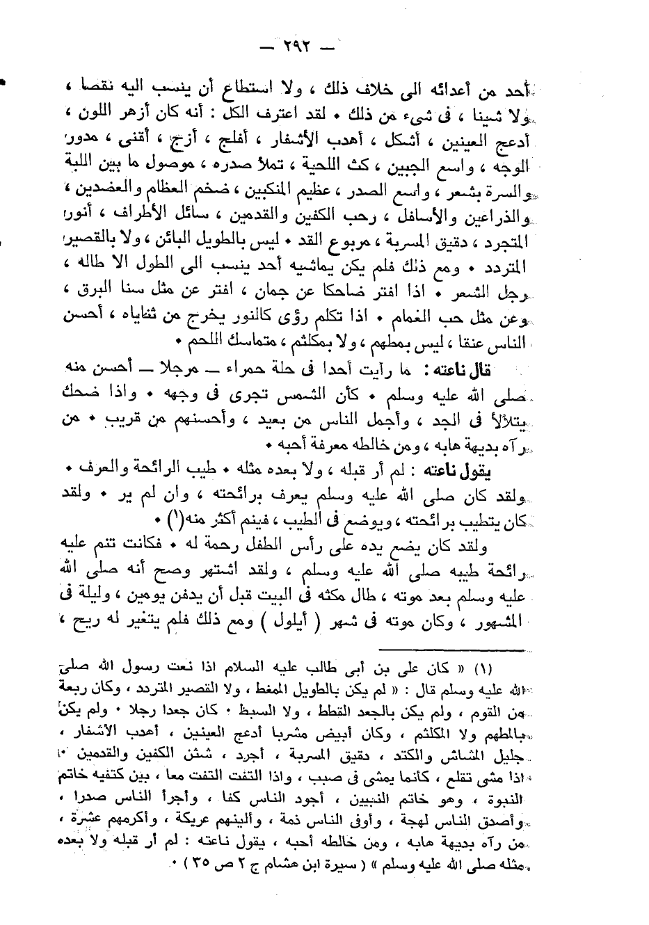 أحد من أعدائه إِلَى خلاف ذَلِك وَلَا اسْتَطَاعَ أَن ينْسب إِلَيْهِ نقصا وَلَا شينا فِي شَيْء من ذَلِك لقد اعْترف الْكل أَنه كَانَ أَزْهَر اللَّوْن أدعج الْعَينَيْنِ أشكل أهدب الأشفار أفلج أَزجّ أقنى مدور الْوَجْه وَاسع الجبين كث اللِّحْيَة تملأ صَدره مَوْصُول مَا بَين اللبة والسرة بِشعر وَاسع الصَّدْر عَظِيم الْمَنْكِبَيْنِ ضخم الْعِظَام والعضدين والذراعين والأسافل رحب الْكَفَّيْنِ والقدمين سَائل الْأَطْرَاف أنور المتجرد دَقِيق المسربة مَرْبُوع الْقد لَيْسَ بالطويل الْبَائِن وَلَا بالقصير المتردد وَمَعَ ذَلِك فَلم يكن يماشيه أحد ينْسب إِلَى الطول إِلَّا طاله رجل الشّعْر إِذا افتر ضَاحِكا عَن جمان افتر عَن مثل سنا الْبَرْق وَعَن مثل حب الْغَمَام إِذا تكلم رؤى كالنور يخرج من ثناياه أحسن النَّاس عنقًا لَيْسَ بمطهم وَلَا بمكلثم متماسك اللَّحْم