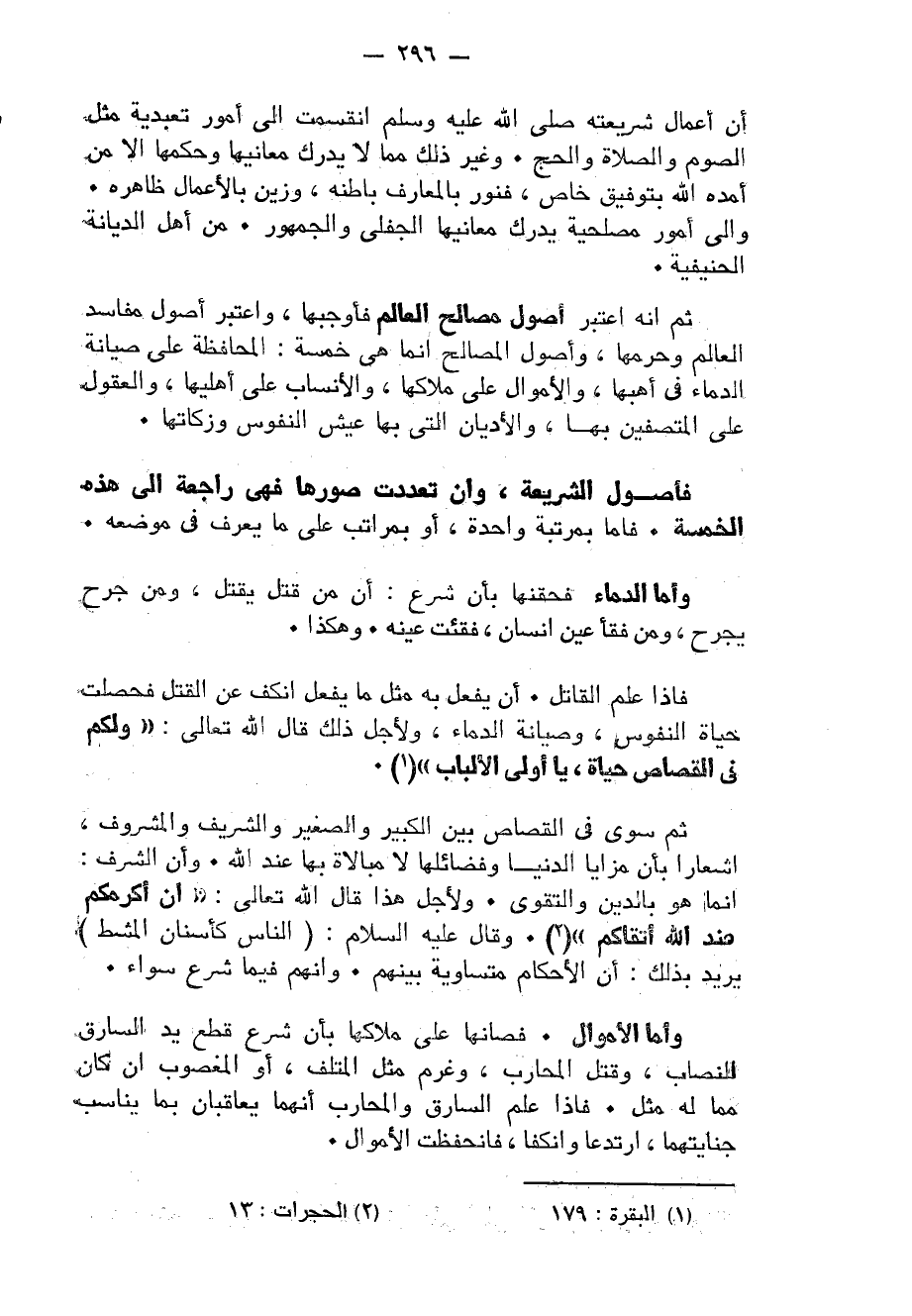 ثمَّ أَنه اعْتبر أصُول مصَالح الْعَالم فأوجبها وَاعْتبر أصُول مفاسد الْعَالم وحرمها وأصول الْمصَالح إِنَّمَا هِيَ خَمْسَة الْمُحَافظَة على صِيَانة الدِّمَاء فِي أهبها وَالْأَمْوَال على ملاكها والأنساب على أهليها والعقول على المتصفين بهَا والأديان الَّتِي بهَا عَيْش النُّفُوس وزكاتها