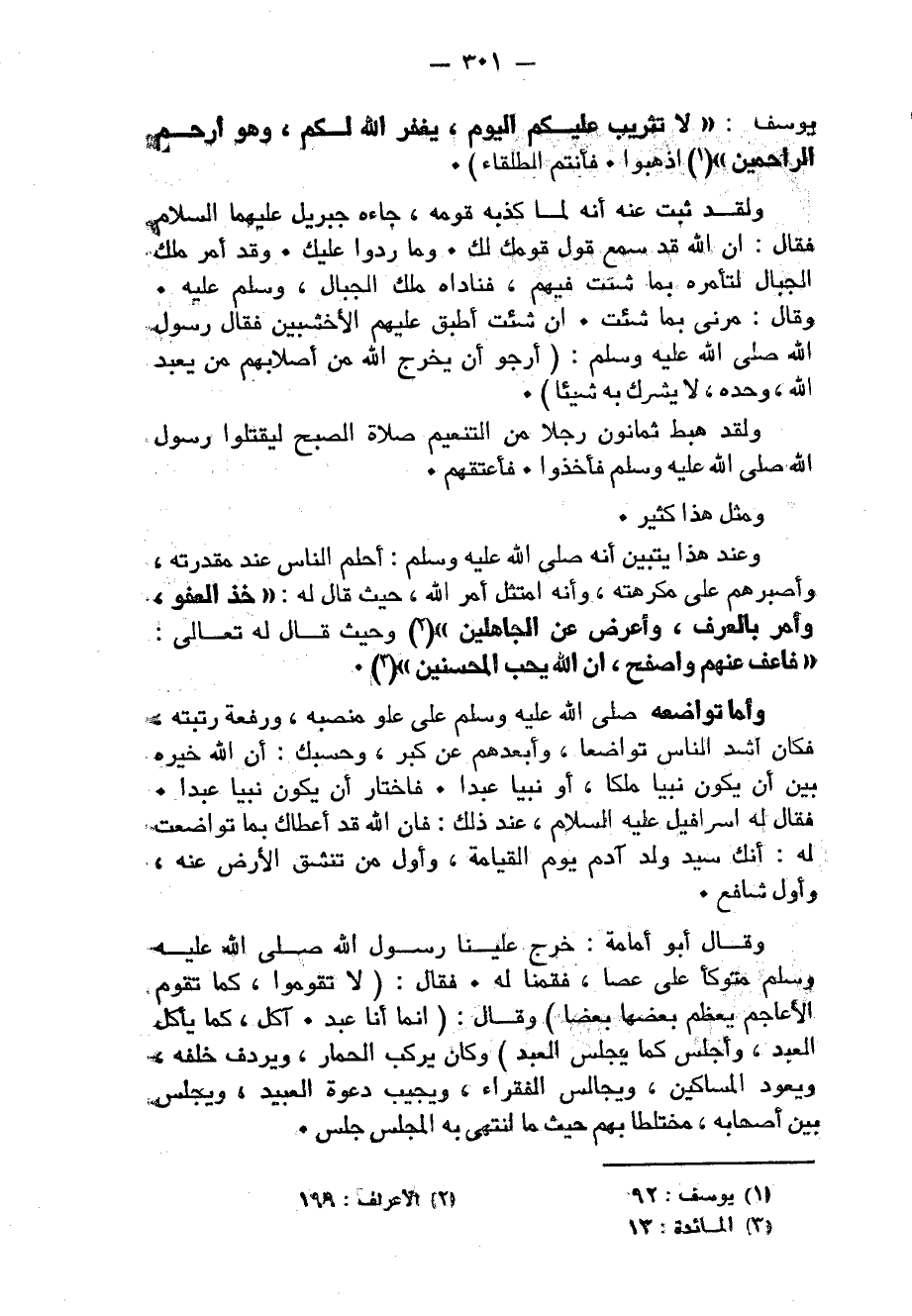 وَعند هَذَا يتَبَيَّن أَنه صلى الله عَلَيْهِ وَسلم أحلم النَّاس عِنْد مقدرته وأصبرهم على مكرهته وَأَنه امتثل أَمر الله حَيْثُ قَالَ لَهُ {خُذ الْعَفو وَأمر بِالْعرْفِ وَأعْرض عَن الْجَاهِلين} وَحَيْثُ قَالَ لَهُ تَعَالَى {فَاعْفُ عَنْهُم وَاصْفَحْ إِن الله يحب الْمُحْسِنِينَ}