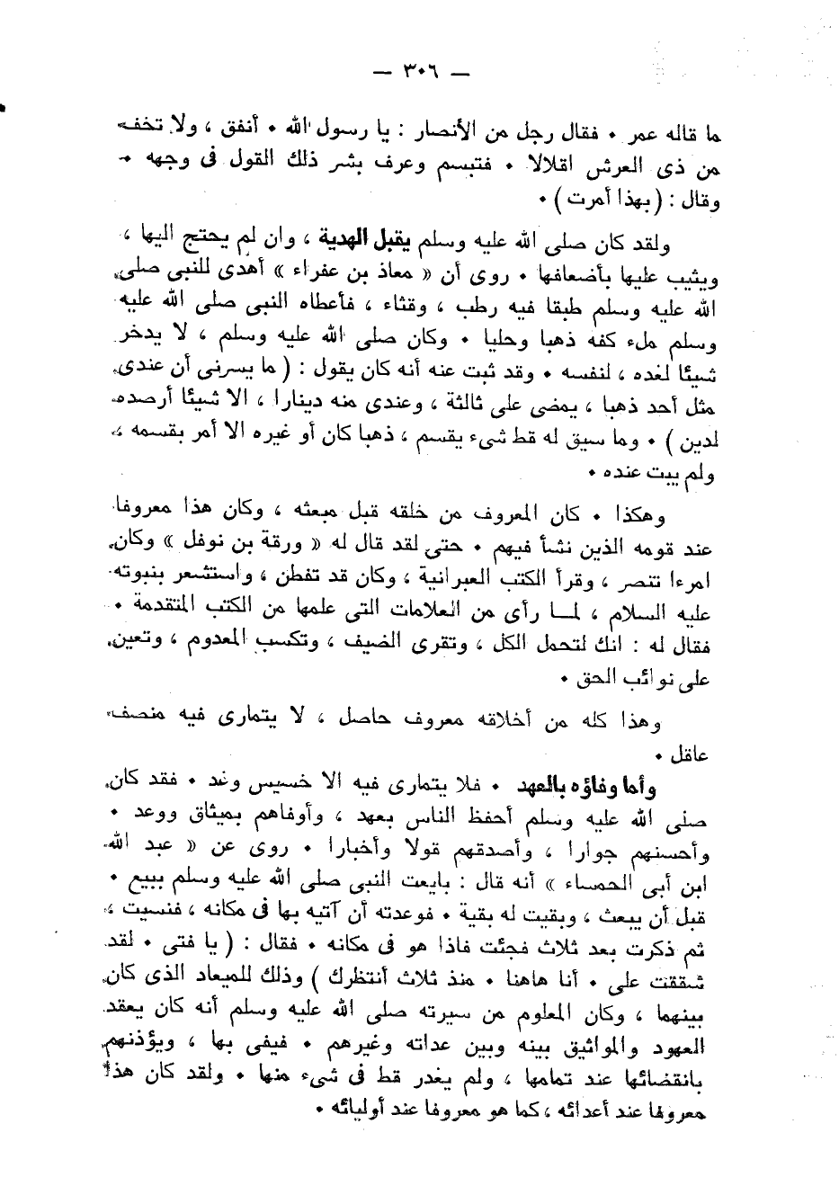 فَلَا يتمارى فِيهِ إِلَّا خسيس وغد فقد كَانَ صلى الله عَلَيْهِ وَسلم أحفظ النَّاس بِعَهْد وأوفاهم بميثاق ووعد وَأَحْسَنهمْ جوارا وأصدقهم قولا وأخبارا روى عَن عبد الله ابْن أبي الحمساء أَنه قَالَ بَايَعت النَّبِي صلى الله عَلَيْهِ وَسلم بِبيع قبل أَن يبْعَث وَبقيت لَهُ بَقِيَّة فوعدته أَن آتيه بهَا فِي مَكَانَهُ فنسيت ثمَّ ذكرت بعد ثَلَاث فَجئْت فَإِذا هُوَ فِي مَكَانَهُ فَقَالَ يَا فَتى لقد شققت عَليّ أَنا هَا هُنَا مُنْذُ ثَلَاث أنتظرك وَذَلِكَ لِلْمِيعَادِ الَّذِي كَانَ بَينهمَا وَكَانَ الْمَعْلُوم من سيرته صلى الله عَلَيْهِ وَسلم أَنه كَانَ يعْقد العهود والمواثيق بَينه وَبَين عداته وَغَيرهم فيفي بهَا ويؤذنهم بإنقضائها عِنْد تَمامهَا وَلم يغدر قطّ فِي شَيْء مِنْهَا وَلَقَد كَانَ هَذَا مَعْرُوفا عِنْد أعدائه كَمَا هُوَ مَعْرُوفا عِنْد أوليائه