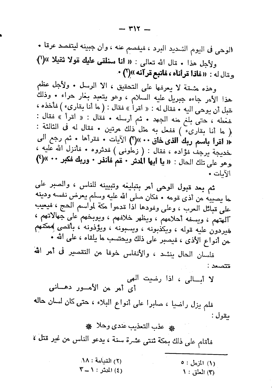 وَهَذِه مشقة لَا يعرفهَا على التَّحْقِيق إِلَّا الرُّسُل وَلأَجل عظم هَذَا الْأَمر جَاءَهُ جِبْرِيل عَلَيْهِ السَّلَام وَهُوَ يتعبد بِغَار حراء وَذَلِكَ قبل أَن يُوحى إِلَيْهِ فَقَالَ لَهُ اقْرَأ فَقَالَ مَا أَنا بقارئ فَأَخذه فغطه حَتَّى بلغ مِنْهُ الْجهد ثمَّ أرْسلهُ فَقَالَ اقْرَأ فَقَالَ مَا أَنا بقارئ فَفعل بِهِ مثل ذَلِك مرَّتَيْنِ فَقَالَ لَهُ فِي الثَّالِثَة {اقْرَأ باسم رَبك الَّذِي خلق} الْآيَات فقرأها ثمَّ رَجَعَ إِلَى خَدِيجَة يرجف فُؤَاده فَقَالَ زَمِّلُونِي فدثروه فَأنْزل الله عَلَيْهِ وَهُوَ على تِلْكَ الْحَال {يَا أَيهَا المدثر قُم فَأَنْذر وَرَبك فَكبر} الْآيَات