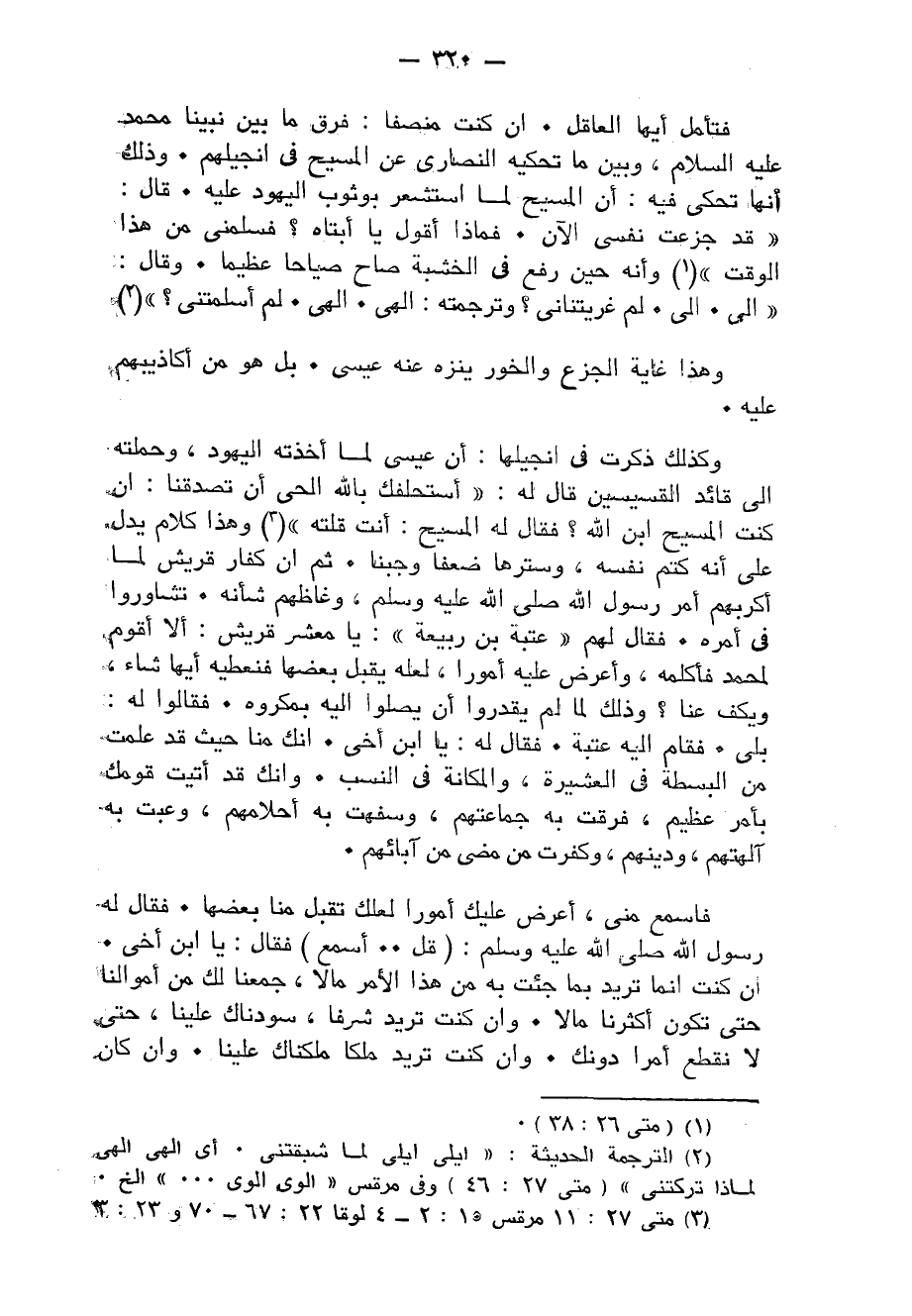 وَكَذَلِكَ ذكرت فِي إنجيلها أَن عِيسَى لما أَخَذته الْيَهُود وَحَمَلته إِلَى قَائِد القسيسين قَالَ لَهُ أستحلفك بِاللَّه الْحَيّ أَن تصدقنا إِن كنت الْمَسِيح ابْن الله فَقَالَ لَهُ الْمَسِيح أَنْت قلته وَهَذَا كَلَام يدل على أَنه كتم نَفسه وسترها ضعفا وجبنا ثمَّ إِن كفار قُرَيْش لما أكربهم أَمر رَسُول الله صلى الله عَلَيْهِ وَسلم وغاظهم شَأْنه تشاوروا فِي أمره فَقَالَ لَهُم عتبَة بن ربيعَة يَا معشر قُرَيْش أَلا أقو م لمُحَمد فأكلمه وَأعْرض عَلَيْهِ أمورا لَعَلَّه يقبل بَعْضهَا فَنُعْطِيه أَيهَا شَاءَ ويكف عَنَّا وَذَلِكَ لما لم يقدروا أَن يصلوا إِلَيْهِ بمكروه فَقَالُوا لَهُ بلَى فَقَامَ إِلَيْهِ عتبَة فَقَالَ لَهُ يَا ابْن أخي إِنَّك منا حَيْثُ قد علمت من البسطة فِي الْعَشِيرَة والمكانة فِي النّسَب وَإنَّك قد أتيت قَوْمك بِأَمْر عَظِيم فرقت بِهِ جَمَاعَتهمْ وسفهت بِهِ أحلامهم وعبت بِهِ آلِهَتهم وَدينهمْ وكفرت من مضى من آبَائِهِم