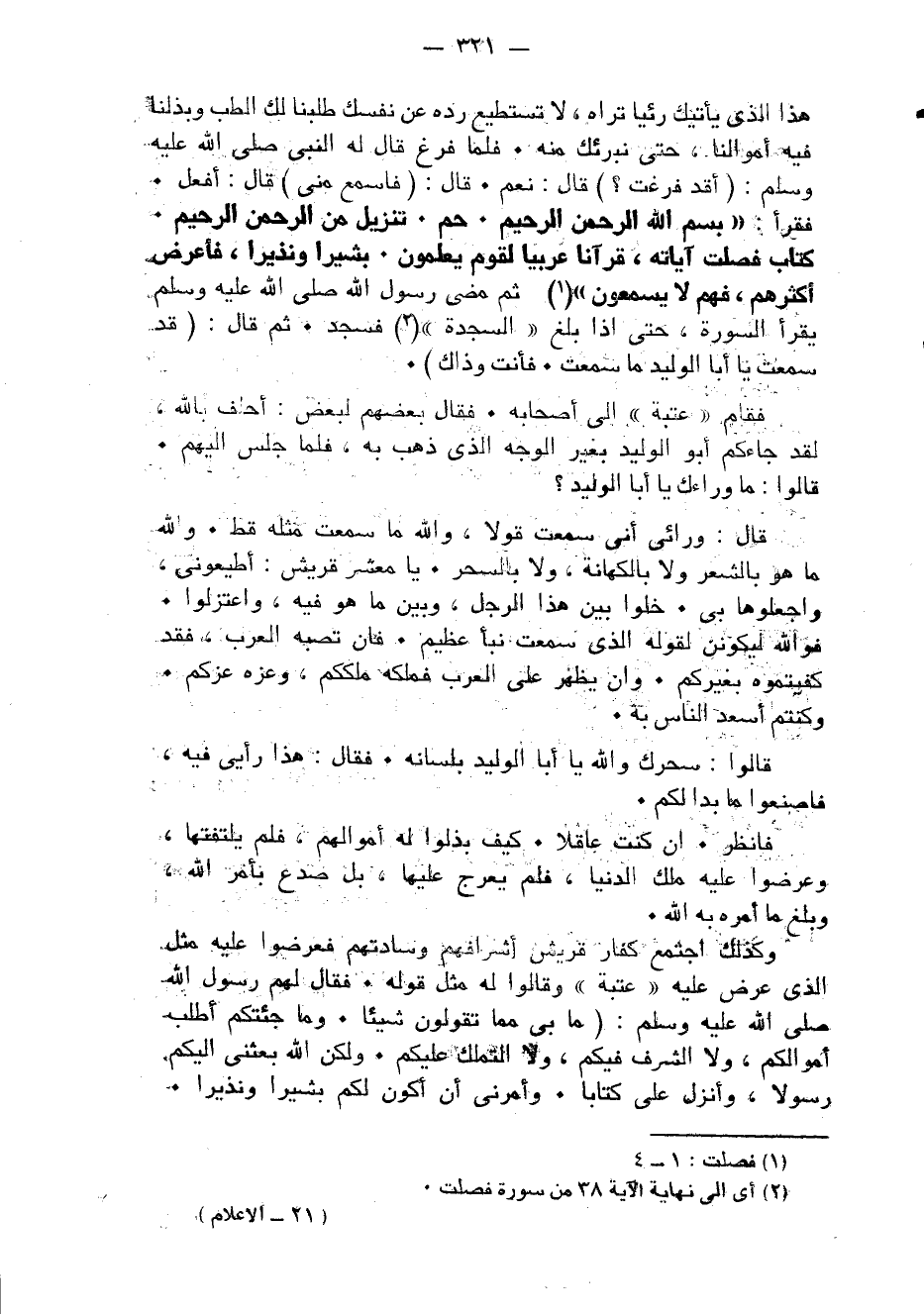 هَذَا الَّذِي يَأْتِيك رئيا ترَاهُ لَا تَسْتَطِيع رده عَن نَفسك طلبنا لَك الطِّبّ وبذلنا فِيهِ أَمْوَالنَا حَتَّى نبرئك مِنْهُ فَلَمَّا فرغ لَهُ النَّبِي صلى الله عَلَيْهِ وَسلم أقد فرغت قَالَ نعم فاسمع مني قَالَ أفعل فَقَرَأَ بِسم الله الرَّحْمَن الرَّحِيم {حم تَنْزِيل من الرَّحْمَن الرَّحِيم كتاب فصلت آيَاته قُرْآنًا عَرَبيا لقوم يعلمُونَ بشيرا وَنَذِيرا فَأَعْرض أَكْثَرهم فهم لَا يسمعُونَ} ثمَّ مضى رَسُول الله صلى الله عَلَيْهِ وَسلم يقْرَأ السُّورَة حَتَّى إِذا بلغ السَّجْدَة فَسجدَ ثمَّ قَالَ قد سَمِعت يَا أَبَا الْوَلِيد مَا سَمِعت فَأَنت وَذَاكَ