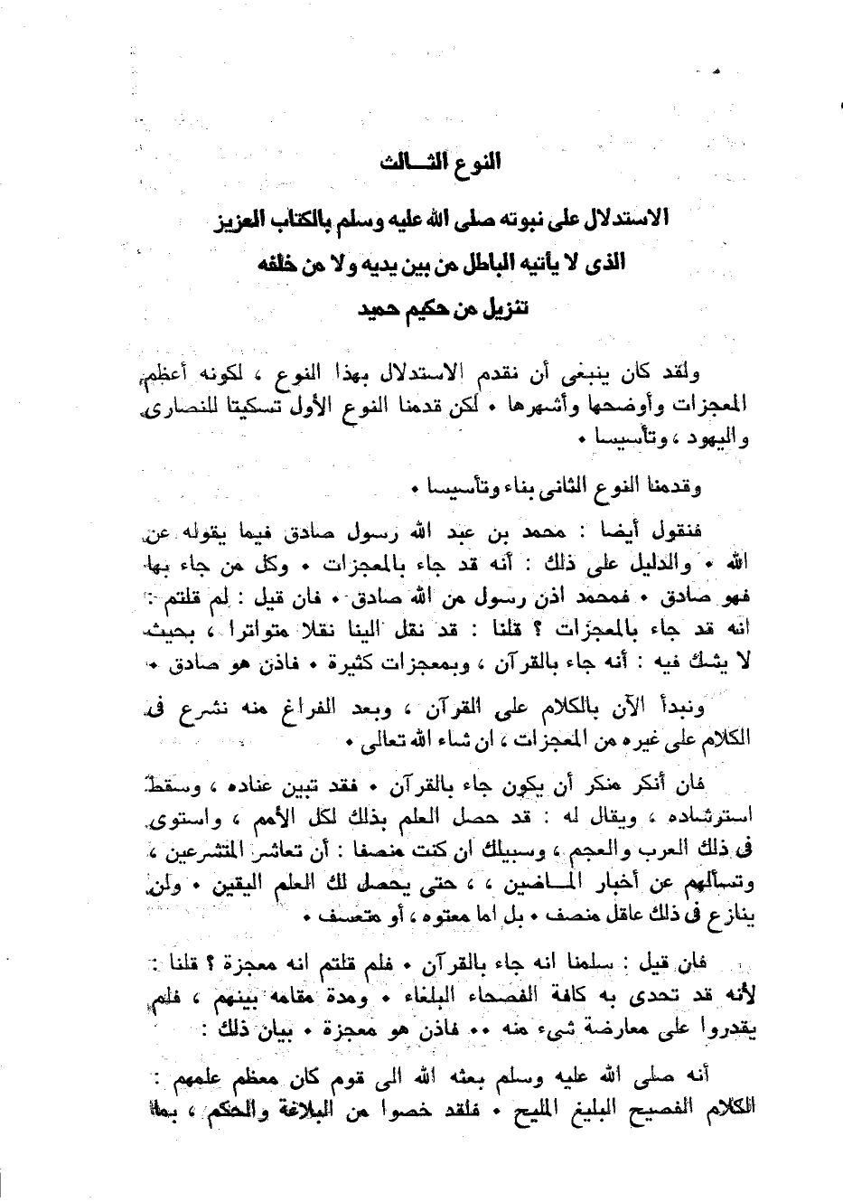 وَلَقَد كَانَ يَنْبَغِي أَن نقدم الإستدلال بِهَذَا النَّوْع لكَونه أعظم المعجزات وأوضحها وأشهرها لَكِن قدمنَا النَّوْع تسكيتا لِلنَّصَارَى وَالْيَهُود وتأسيسا
