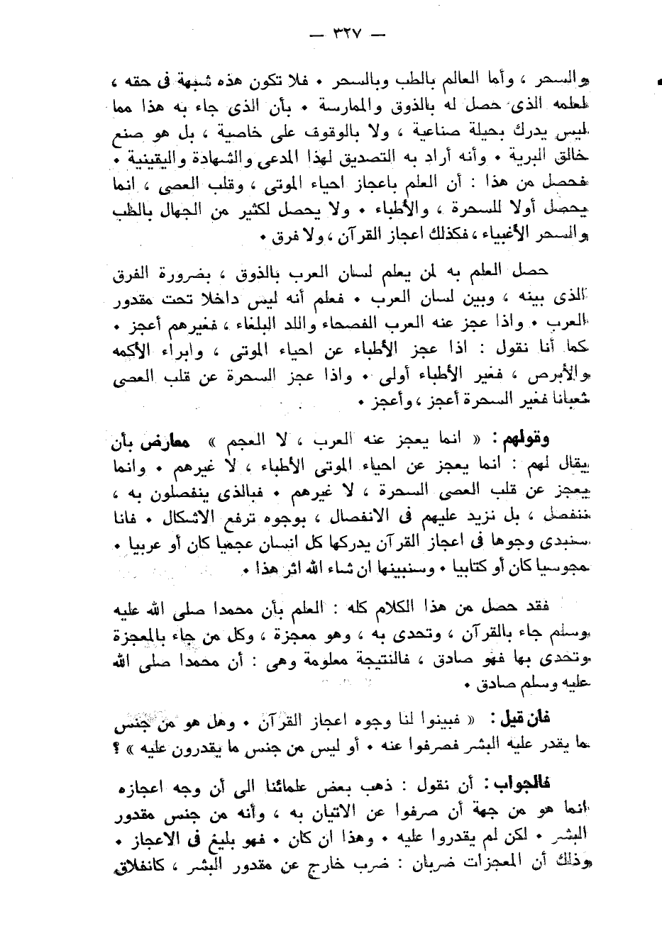 وَالسحر وَأما الْعَالم بالطب وبالسحر فَلَا تكون هَذِه شُبْهَة فِي حَقه لعلمه الَّذِي حصل لَهُ بالذوق والممارسه بِأَن الَّذِي جَاءَ بِهِ هَذَا مِمَّا لَيْسَ يدْرك بحيلة صناعية وَلَا بِالْوُقُوفِ على خاصية بل هُوَ صنع خَالق الْبَريَّة وَأَنه أَرَادَ بِهِ التَّصْدِيق لهَذَا الْمُدَّعِي وَالشَّهَادَة واليقينية فَحصل من هَذَا أَن الْعلم بإعجاز إحْيَاء الْمَوْتَى وقلب العصى إِنَّمَا يحصل أَولا للسحرة والأطباء وَلَا يحصل لكثير من الْجُهَّال بالطب وَالسحر الأغبياء فَكَذَلِك إعجاز الْقُرْآن وَلَا فرق