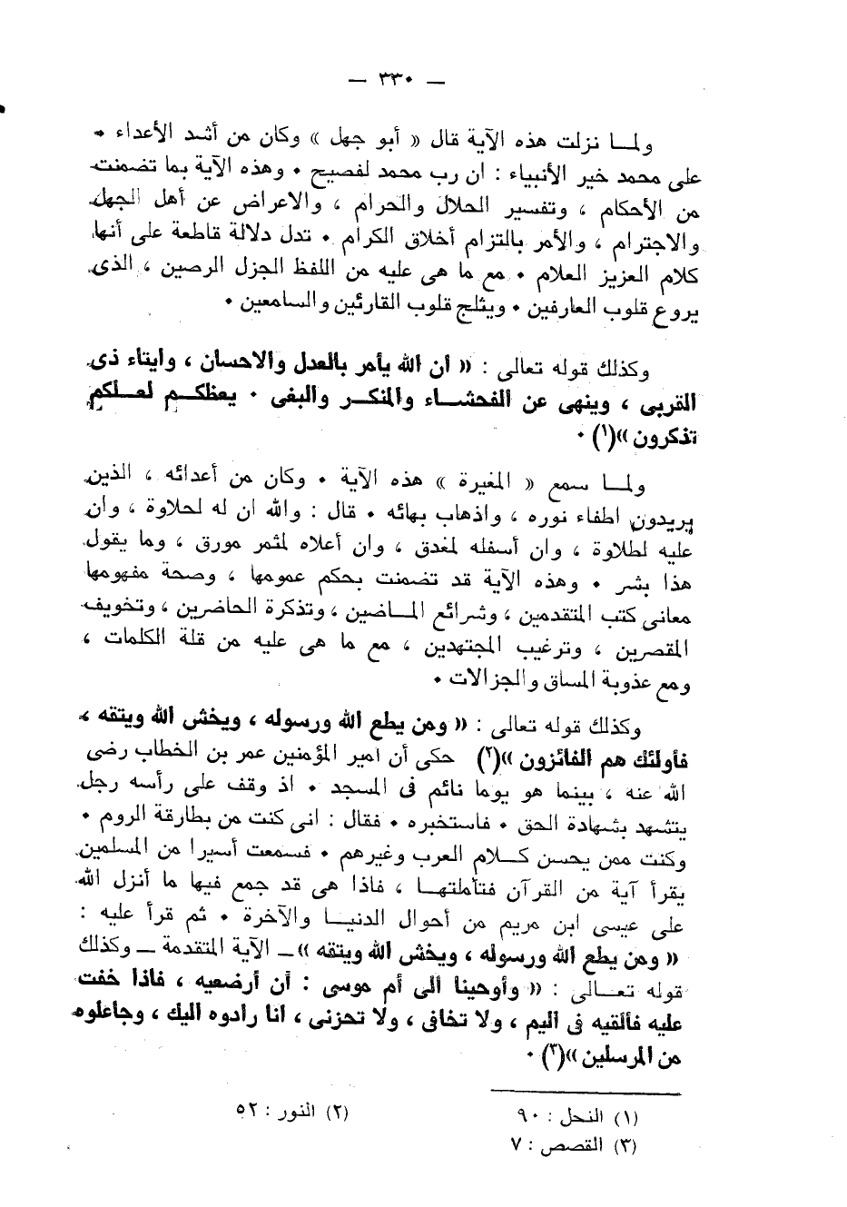 وَكَذَلِكَ قَوْله تَعَالَى {وَمن يطع الله وَرَسُوله ويخش الله ويتقه فَأُولَئِك هم الفائزون} حكى أَن أَمِير الْمُؤمنِينَ عمر بن الْخطاب رَضِي الله عَنهُ بَيْنَمَا هُوَ يَوْمًا نَائِم فِي الْمَسْجِد إِذْ وقف على رَأسه رجل يتَشَهَّد بِشَهَادَة الْحق فاستخبره فَقَالَ إِنِّي كنت من بطارقة الرّوم وَكنت مِمَّن يحسن كَلَام الْعَرَب وَغَيرهم فَسمِعت أَسِيرًا من الْمُسلمين يقْرَأ آيَة من الْقُرْآن فتأملتها فَإِذا هِيَ قد جمع فِيهَا مَا أنزل الله على عِيسَى ابْن مَرْيَم من أَحْوَال الدُّنْيَا وَالْآخِرَة ثمَّ قَرَأَ عَلَيْهِ {وَمن يطع الله وَرَسُوله ويخش الله ويتقه} الْآيَة الْمُتَقَدّمَة وَكَذَلِكَ قَوْله تَعَالَى {وأوحينا إِلَى أم مُوسَى أَن أرضعيه فَإِذا خفت عَلَيْهِ فألقيه فِي اليم وَلَا تخافي وَلَا تحزني إِنَّا رادوه إِلَيْك وجاعلوه من الْمُرْسلين}