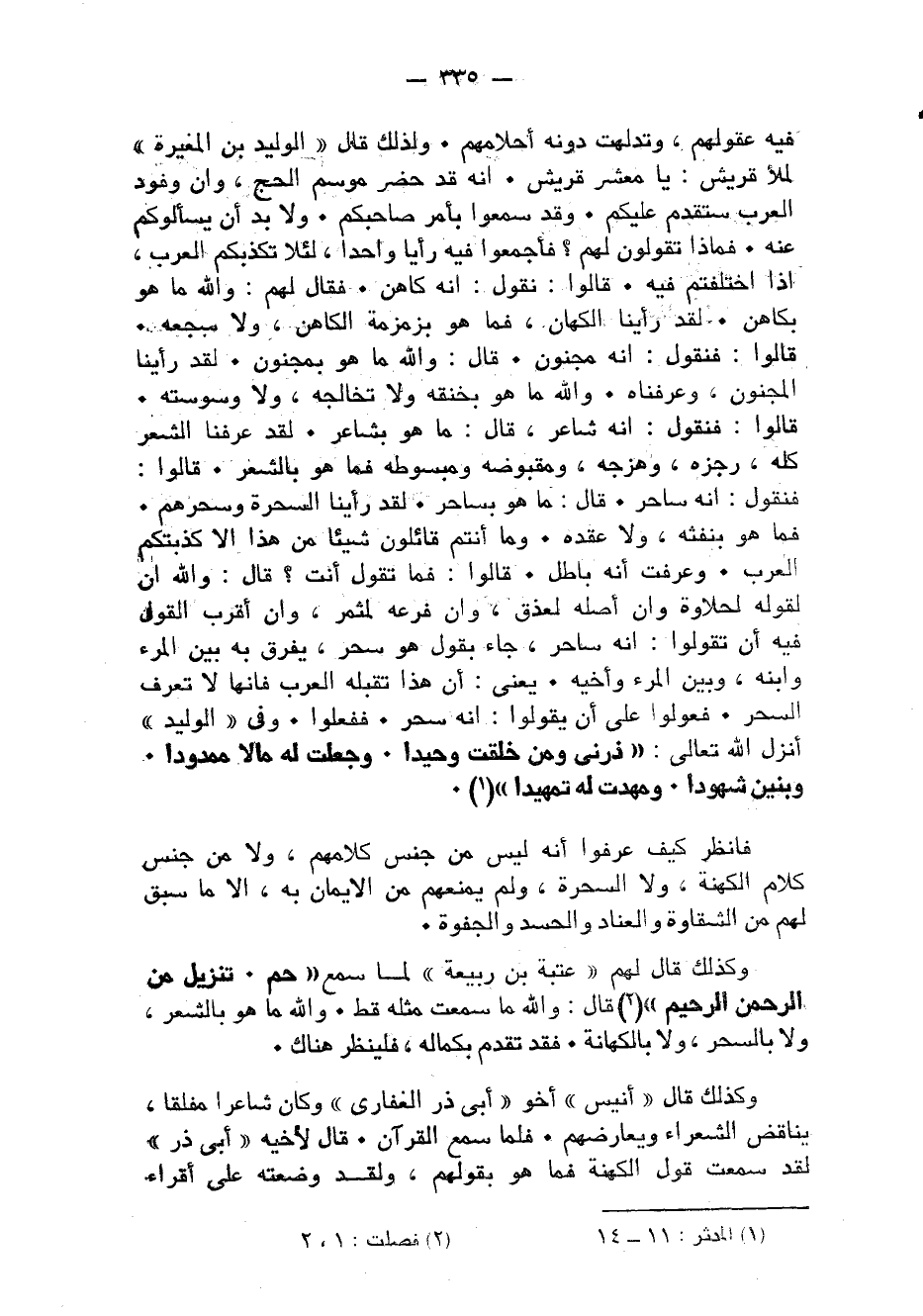 فِيهِ عُقُولهمْ وتدلهت دونه أحلامهم وَلذَلِك قَالَ الْوَلِيد بن الْمُغيرَة لملأ قُرَيْش يَا معشر قُرَيْش أَنه قد حضر موسم الْحَج وَإِن وُفُود الْعَرَب ستقدم عَلَيْكُم وَقد سمعُوا بِأَمْر صَاحبكُم وَلَا بُد أَن يسألوكم عَنهُ فَمَاذَا تَقولُونَ لَهُم فَأَجْمعُوا فِيهِ رَأيا وَاحِدًا لِئَلَّا تكذبكم الْعَرَب إِذا اختلفتم فِيهِ قَالُوا نقُول إِنَّه كَاهِن فَقَالَ لَهُم وَالله مَا هُوَ بكاهن لقد رَأينَا الْكُهَّان فَمَا هُوَ بزمزمة الكاهن وَلَا سجعه قَالُوا فَنَقُول أَنه مَجْنُون قَالَ وَالله مَا هُوَ بمجنون لقد رَأينَا الْمَجْنُون وعرفناه وَالله مَا هُوَ بخنقه وَلَا تخالجه وَلَا وسوسته قَالُوا فَنَقُول إِنَّه شَاعِر قَالَ مَا هُوَ بشاعر لقد عرفنَا الشّعْر كُله رجزه وهزجه ومقبوضه ومبسوطه فَمَا هُوَ بالشعر قَالُوا فَنَقُول إِنَّه سَاحر قَالَ مَا هُوَ بساحر لقد رَأينَا السحر وسحرهم فَمَا هُوَ بنفثه وَلَا عقده وَمَا أَنْتُم قَائِلُونَ شَيْئا من هَذَا إِلَّا كذبتكم الْعَرَب وَعرفت أَنه بَاطِل قَالُوا فَمَا تَقول أَنْت قَالَ وَالله إِن لقَوْله لحلاوة وَإِن أَصله لعذق وَإِن فَرعه لمثمر وَإِن أقرب القَوْل فِيهِ أَن تَقولُوا إِنَّه سَاحر جَاءَ بقول هُوَ سحر يفرق بِهِ بَين الْمَرْء وإبنه وَبَين الْمَرْء وأخيه يعْنى أَن هَذَا تقبله الْعَرَب فَإِنَّهَا لاتعرف السحر فعولوا على أَن يَقُولُوا إِنَّه سحر فَفَعَلُوا وَفِي الْوَلِيد أنزل الله تَعَالَى {ذَرْنِي وَمن خلقت وحيدا وَجعلت لَهُ مَالا ممدودا وبنين شُهُودًا ومهدت لَهُ تمهيدا}