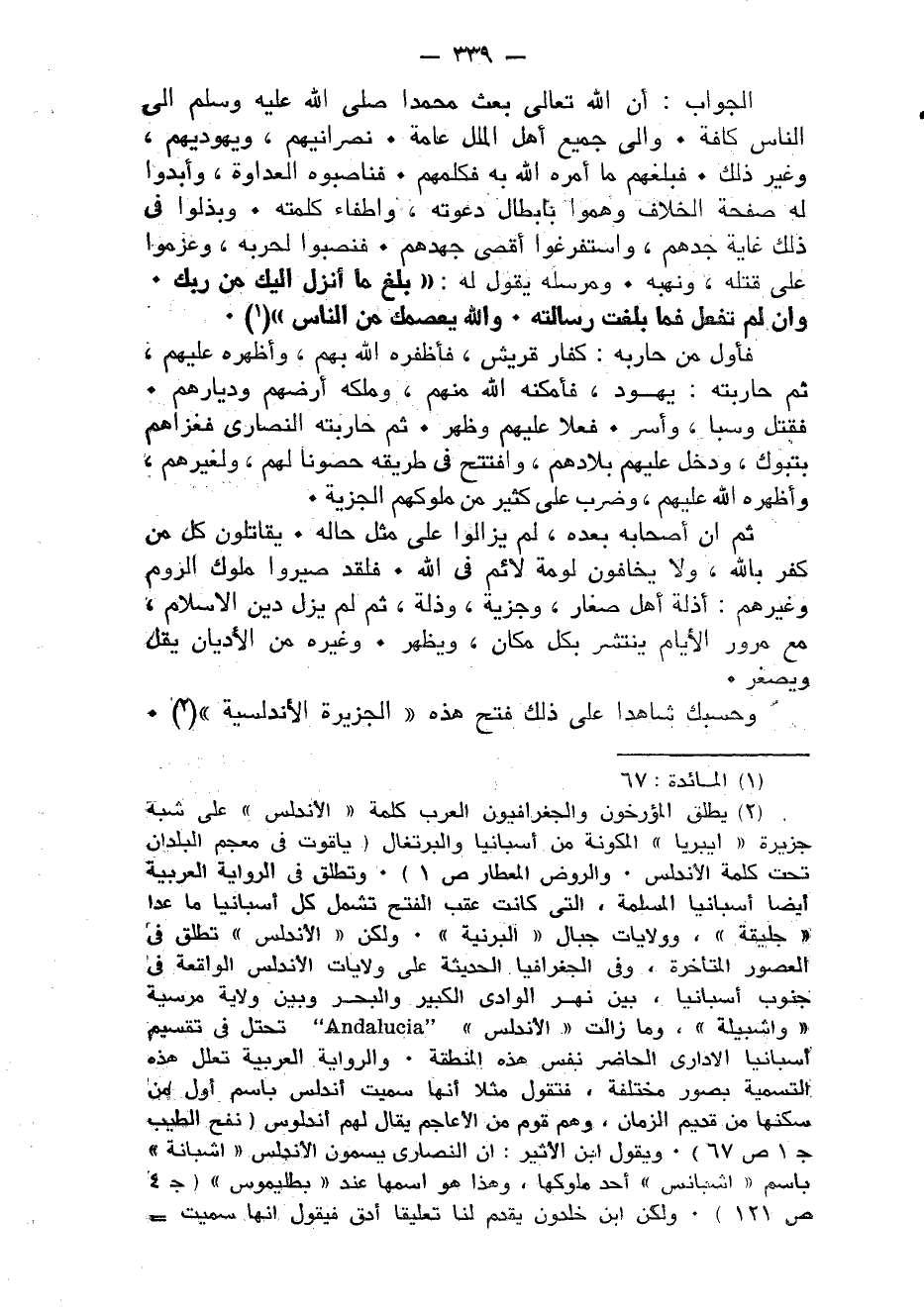 الْجَواب أَن الله تَعَالَى بعث مُحَمَّدًا صلى الله عَلَيْهِ وَسلم إِلَى النَّاس كَافَّة وَإِلَى جَمِيع أهل الْملَل عَامَّة نصرانيهم ويهوديهم وَغير ذَلِك فَبَلغهُمْ مَا أمره الله فَكَلَّمَهُمْ فناصبوه العداة وأبدوا لَهُ صفحة الْخلاف وهموا بِإِبْطَال دَعوته وإطفاء كَلمته وبذلوا فِي ذَلِك غَايَة جدهم واستفرغوا أقْصَى جهدهمْ فنصبوا لحربه وعزموا على قَتله ونهبه ومرسله يَقُول لَهُ {بلغ مَا أنزل إِلَيْك من رَبك وَإِن لم تفعل فَمَا بلغت رسَالَته وَالله يَعْصِمك من النَّاس}