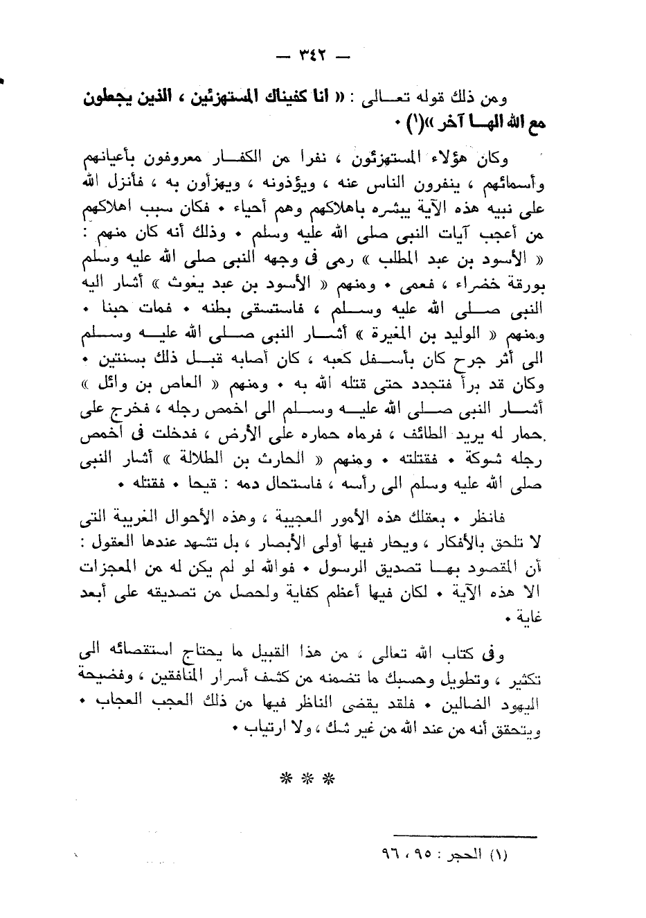 وَكَانَ هَؤُلَاءِ المستهزئون نَفرا من الْكفَّار معروفون بأعيانهم وأسمائهم ينفرون النَّاس عَنهُ ويؤذونه ويهزأون بِهِ فَأنْزل الله على نبيه هَذِه الْآيَة يبشره بإهلاكهم وهم أَحيَاء فَكَانَ سَبَب أهلاكهم من أعجب آيَات النَّبِي صلى الله عَلَيْهِ وَسلم وَذَلِكَ أَنه كَانَ مِنْهُم الْأسود بن عبد المطلب رمى فِي وَجهه النَّبِي صلى الله عَلَيْهِ وَسلم بِوَرَقَة خضراء فَعمى وَمِنْهُم الْأسود بن عبد يَغُوث أَشَارَ إِلَيْهِ النَّبِي صلى الله عَلَيْهِ وَسلم فَاسْتَسْقَى بَطْنه فَمَاتَ حبنا وَمِنْه الْوَلِيد بن الْمُغيرَة أَشَارَ النَّبِي صلى الله عَلَيْهِ وَسلم إِلَى أثر جرح كَانَ بِأَسْفَل كَعبه كَانَ أَصَابَهُ قبل ذَلِك بِسنتَيْنِ وَكَانَ قد برأَ فتجدد حَتَّى قَتله الله بِهِ وَمِنْه الْعَاصِ بن وَائِل أَشَارَ النَّبِي صلى الله عَلَيْهِ وَسلم إِلَى أَخْمص رجله فَخرج على حمَار لَهُ يُرِيد الطَّائِف فَرَمَاهُ حِمَاره على الأَرْض فَدخلت فِي أَخْمص رجله شَوْكَة فَقتلته وَمِنْه الْحَارِث بن الطلالة أَشَارَ النَّبِي صلى الله عَلَيْهِ وَسلم إِلَى رَأسه فاستحال دَمه قَيْحا فَقتله