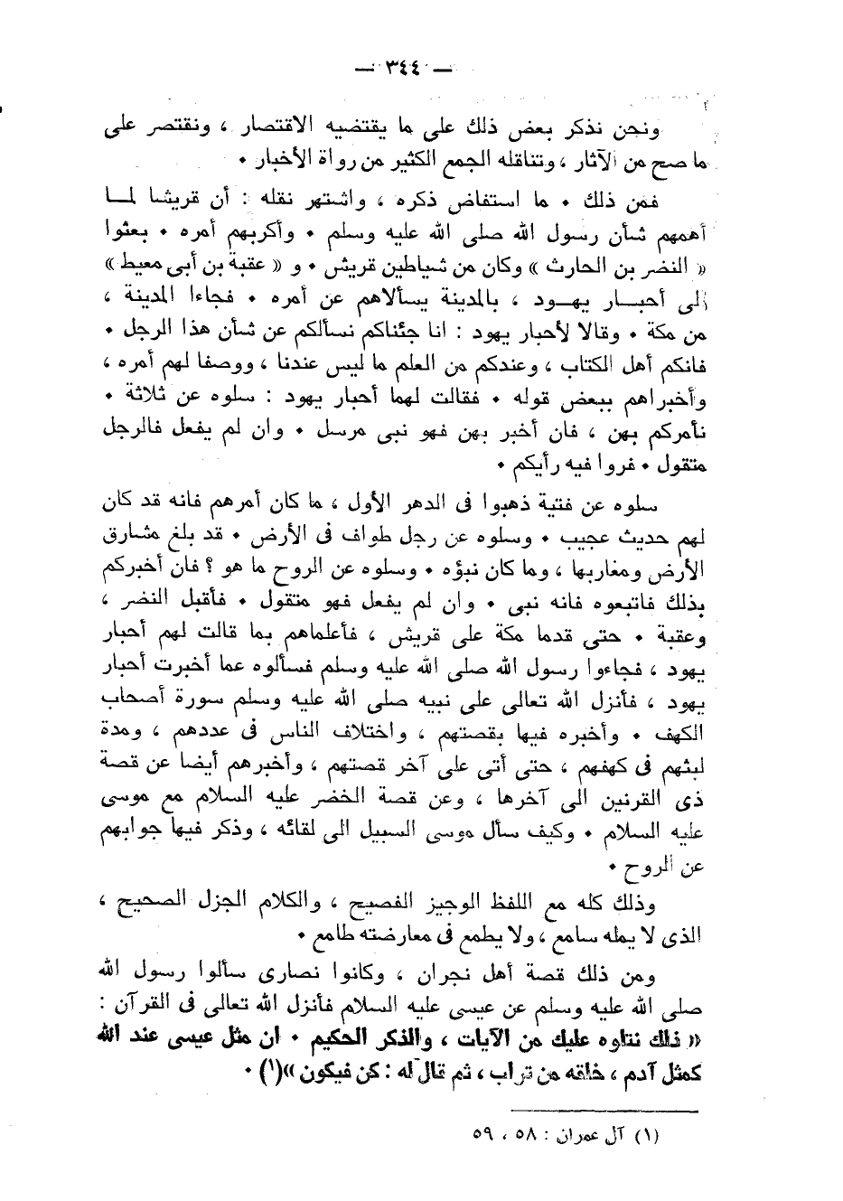 وَمن ذَلِك قصَّة أهل نَجْرَان وَكَانُوا نَصَارَى سَأَلُوا رَسُول الله صلى الله عَلَيْهِ وَسلم عَن عِيسَى عَلَيْهِ السَّلَام فَأنْزل الله تَعَالَى فِي الْقُرْآن {ذَلِك نتلوه عَلَيْك من الْآيَات وَالذكر الْحَكِيم إِن مثل عِيسَى عِنْد الله كَمثل آدم خلقه من تُرَاب ثمَّ قَالَ لَهُ كن فَيكون}