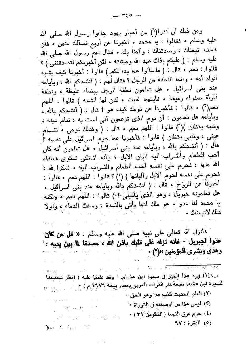 وَمن ذَلِك أَن نَفرا من أَحْبَار يهود جَاءُوا رَسُول الله صلى الله عَلَيْهِ وَسلم فَقَالُوا يَا مُحَمَّد أخبرنَا عَن أَربع نَسْأَلك عَنْهُن فَإِن فعلت اتَّبَعْنَاك وَصَدَّقنَاك وآمنا بك فَقَالَ لَهُم رَسُول الله صلى الله عَلَيْهِ وَسلم عَلَيْكُم بذلك عهد الله وميثاقه لَئِن أَخْبَرتكُم لتصدقنني قَالُوا نعم قَالَ فاسألوا عَمَّا بدا لكم قَالُوا أخبرنَا كَيفَ يشبه الْوَلَد أمه وَإِنَّمَا النُّطْفَة من الرجل فَقَالَ لَهُم أنْشدكُمْ الله وبأيامه عِنْد بني إِسْرَائِيل هَل تعلمُونَ نُطْفَة الرجل بَيْضَاء غَلِيظَة ونطفة الْمَرْأَة صفراء رقيقَة فأيتهما غلبت كَانَ لَهَا الشّبَه قَالُوا اللَّهُمَّ نعم قَالُوا فَأخْبرنَا عَن نومك كَيفَ هُوَ قَالَ أنْشدكُمْ بِاللَّه وبأيامه هَل تعلمُونَ أَن نوم الَّذِي تَزْعُمُونَ أَنِّي لست بِهِ تنام عينه وَقَلبه يقظان قَالُوا اللَّهُمَّ نعم قَالَ وَكَذَلِكَ نومي تنام عَيْني وقلبي يقظان قَالُوا فَأخْبرنَا عَمَّا حرم إِسْرَائِيل على نَفسه قَالَ أنْشدكُمْ بِاللَّه وبأيامه عِنْد بني إِسْرَائِيل هَل تعلمُونَ أَنه كَانَ أحب الطَّعَام وَالشرَاب إِلَيْهِ ألبان الْإِبِل وَأَنه اشْتَكَى شكوى فعافاه الله مِنْهَا فَحرم على نَفسه أحب الطَّعَام وَالشرَاب إِلَيْهِ شكرا لله فَحرم على نَفسه لُحُوم الْإِبِل وَأَلْبَانهَا قَالُوا اللَّهُمَّ نعم قَالُوا أخبرنَا عَن الرّوح قَالَ أنْشدكُمْ بِاللَّه وبأيامه عِنْد بني إِسْرَائِيل هَل تعلمونه جِبْرِيل وَهُوَ الَّذِي يأتيني قَالُوا اللَّهُمَّ نعم وَلكنه يَا مُحَمَّد لنا عَدو هُوَ ملك إِنَّمَا يَأْتِي بالشدة وَسَفك الدِّمَاء وَلَوْلَا ذَلِك لاتبعناك