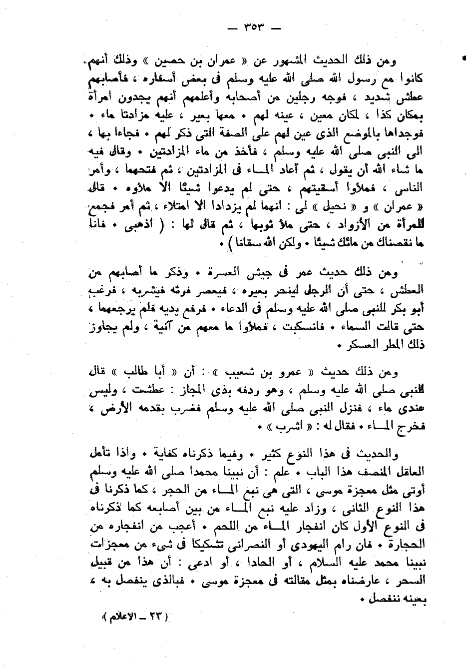 وَمن ذَلِك الحَدِيث الْمَشْهُور عَن عمرَان بن حُصَيْن وَذَلِكَ أَنهم كَانُوا مَعَ رَسُول الله صلى الله عَلَيْهِ وَسلم فِي بعض أَسْفَاره فَأَصَابَهُمْ عَطش شَدِيد فَوجه رجلَيْنِ من أَصْحَابه وأعلمهم أَنهم يَجدونَ امْرَأَة بمَكَان كَذَا لمَكَان معِين عنيه لَهُم مَعهَا بعير عَلَيْهِ مزادتا مَاء فوجداها بالموضع الَّذِي عين لَهُم على الصّفة الَّتِى ذكر لَهُم فجاءا بهَا الى النَّبِي صلى الله عَلَيْهِ وَسلم فَأخذ من مَاء المزادتين وَقَالَ فِيهِ ماشاء الله أَن يَقُول ثمَّ أعَاد المَاء فِي المزادتين ثمَّ فتحهما وَأمر النَّاس فملأوا أسقيتهم حَتَّى لم يدعوا شَيْئا إِلَّا ملأوه قَالَ عمرَان ونحيل لي أَنَّهُمَا لم يزدادا إِلَّا إمتلاء ثمَّ أَمر فَجمع للْمَرْأَة من الأزواد حَتَّى مَلأ ثوبها ثمَّ قَالَ لَهَا اذهبي فانا مَا نقصناك من مائك شَيْئا وَلَكِن الله سقانا